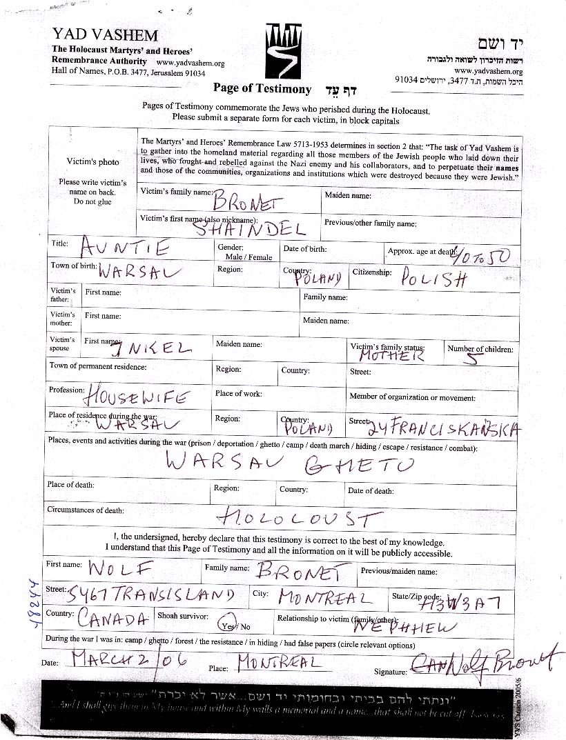 Szaindel Bronet. Sie war Hausfrau. Vor dem Zweiten Weltkrieg lebte sie in Warszawa, Polen.