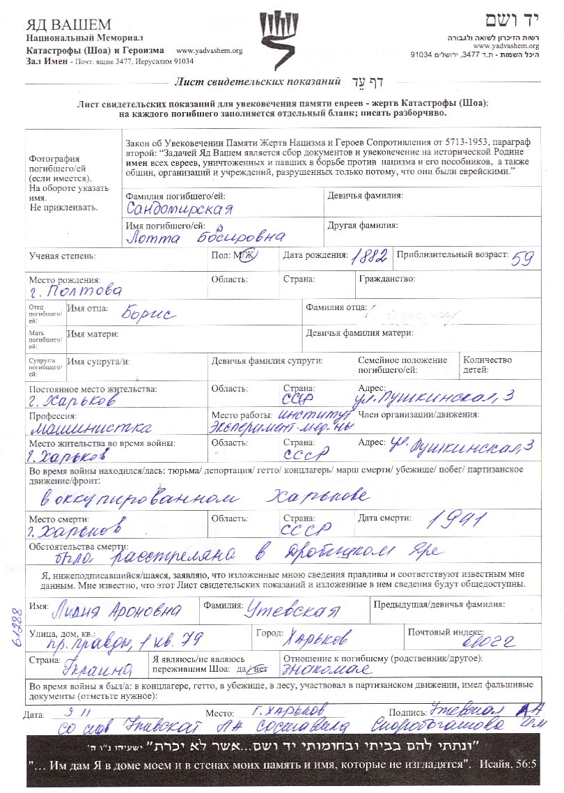 Lotta Sandomirskaya wurde im Jahr 1882 in Lokhvitsa, Ukraine (UdSSR) geboren. Sie war Typistin. Vor dem Zweiten Weltkrieg lebte sie in Kharkov, Ukraine (UdSSR).