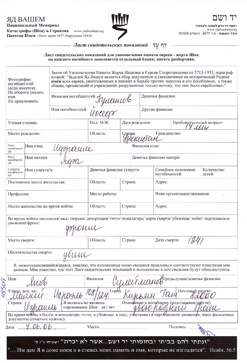 Yusup wurde in der Schoah ermordet. Todesort: Kursk, Russland (UdSSR) im Jahr 1943.