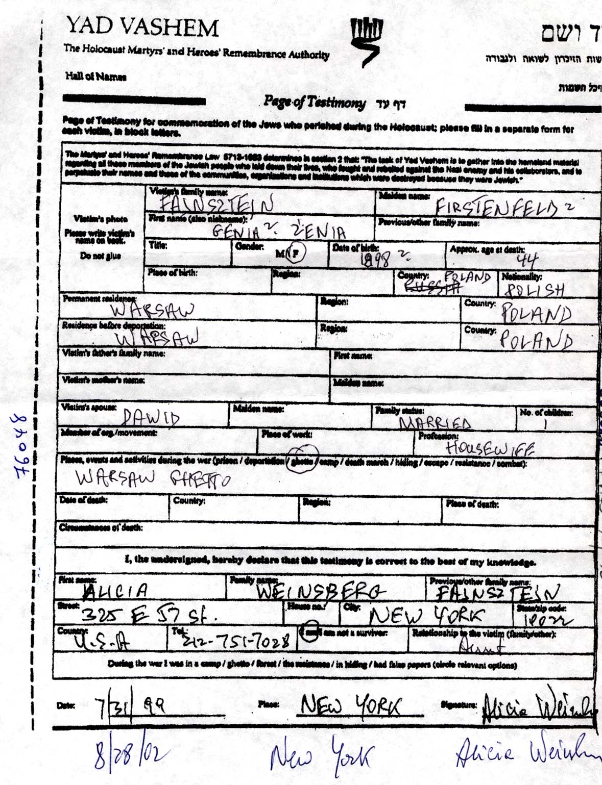 Genya Zenia Feinstein, geb. Firstenfeld wurde im Jahr 1898 in Warszawa, Polen geboren. Sie war Hausfrau. Vor dem Zweiten Weltkrieg lebte sie in Warszawa, Polen.