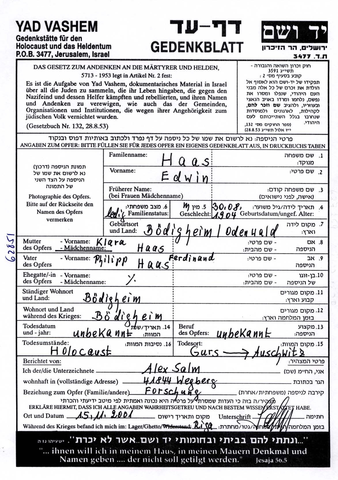 Edwin Haas wurde im Jahr 1904 in Boedigheim, Deutsches Reich geboren. Vor dem Zweiten Weltkrieg lebte er in Boedigheim, Deutsches Reich.
