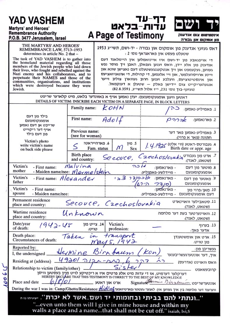 Kohn Adolf 1925 Secovce, Tschechoslowakei Liste von Deportierten