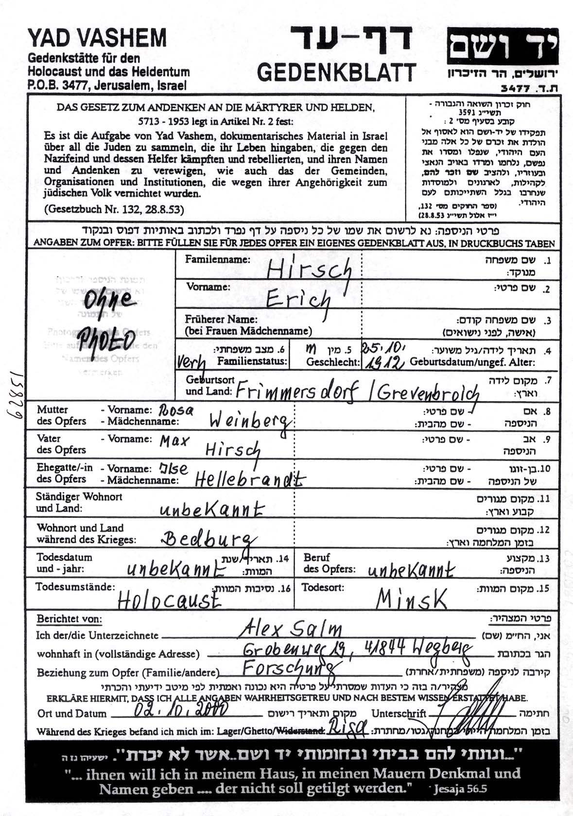 | Hirsch | Erich | 1925 | unbekannter Ort, | Gedenkblatt |