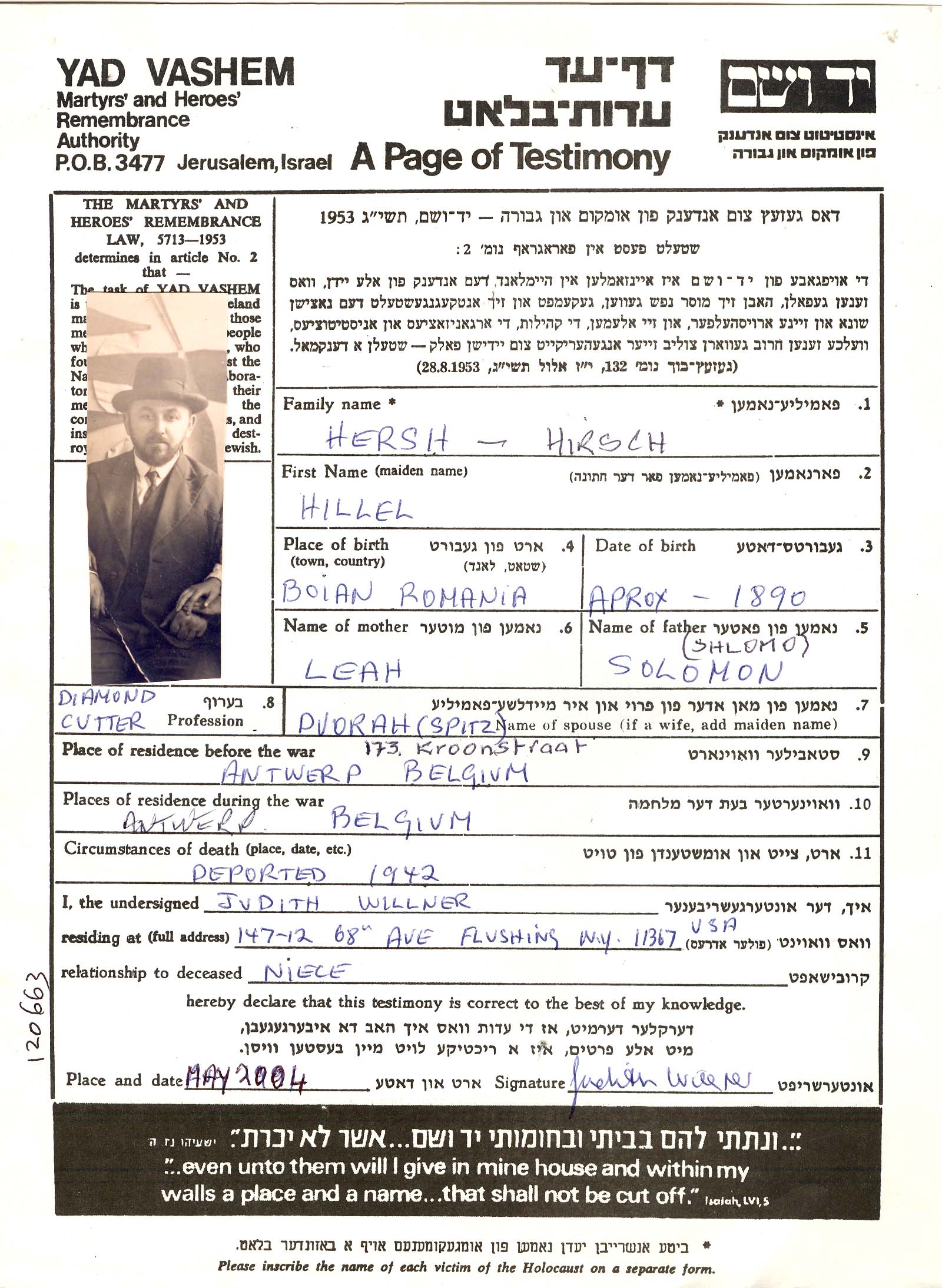 | Hersh Hirsch | Hillel | 1890 | Antwerpen, Belgien | Gedenkblatt |