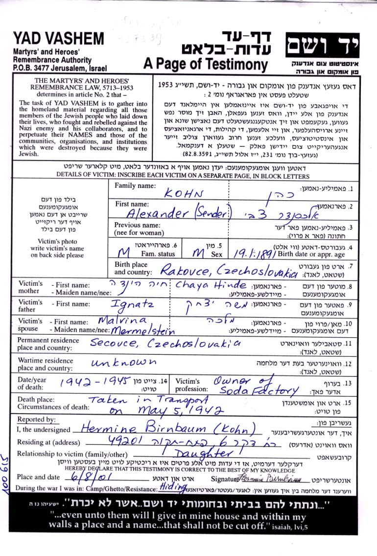 Kohn Alexander 1891 Rakovce, Tschechoslowakei Liste von Deportierten