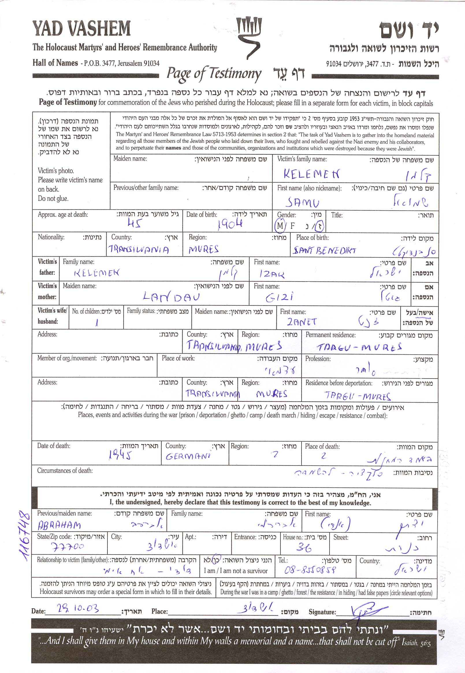 Shmuel Samu Kelemen wurde im Jahr 1904 in Szentbenedek, Rumänien geboren. Er war Kaufmann/-frau. Vor dem Zweiten Weltkrieg lebte er in Targu Mures, Rumänien.