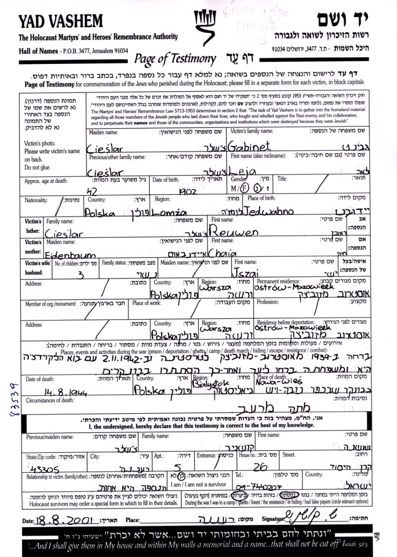 Lea Gabinet wurde im Jahr 1902 in Polen geboren. Vor dem Zweiten Weltkrieg lebte sie in Ostrów Mazowiecka, Polen.