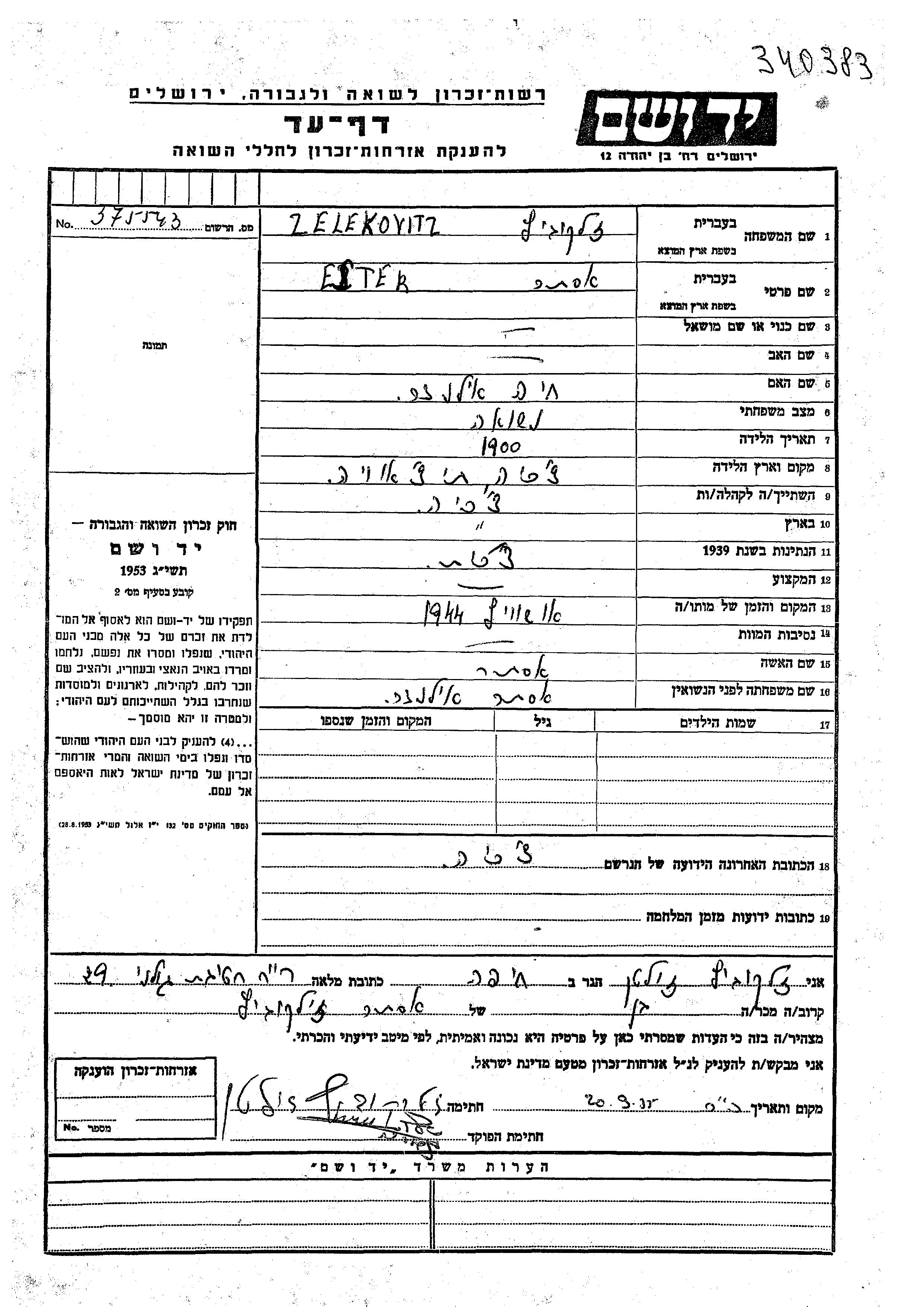 Ester Zelikovicz, geb. Eilender wurde im Jahr 1892 in Tacovo, Tschechoslowakei geboren. Vor dem Zweiten Weltkrieg lebte sie in Tacovo, Tschechoslowakei.