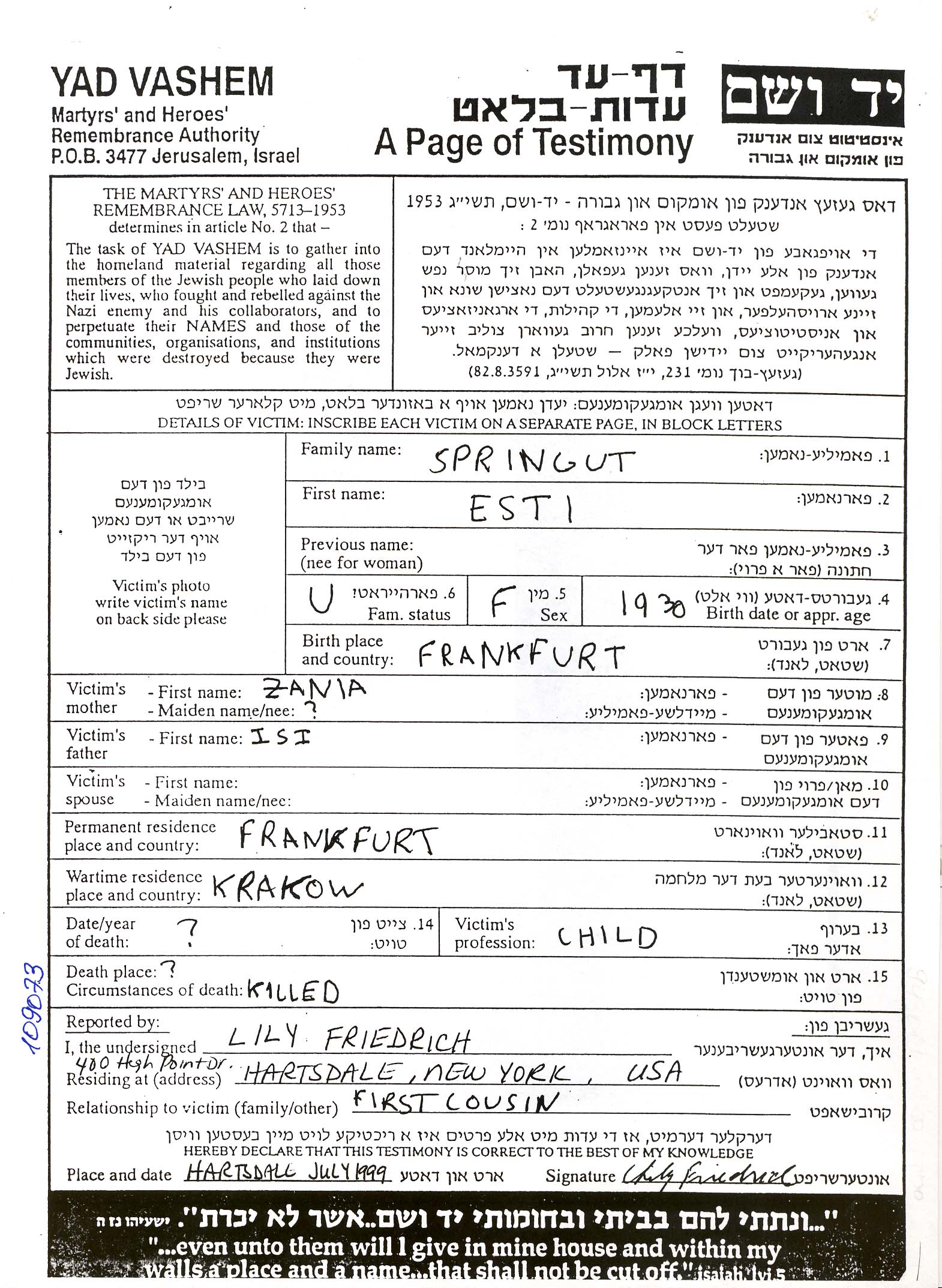 Springut Esther 1930 unbekannter Ort, Gedenkblatt
