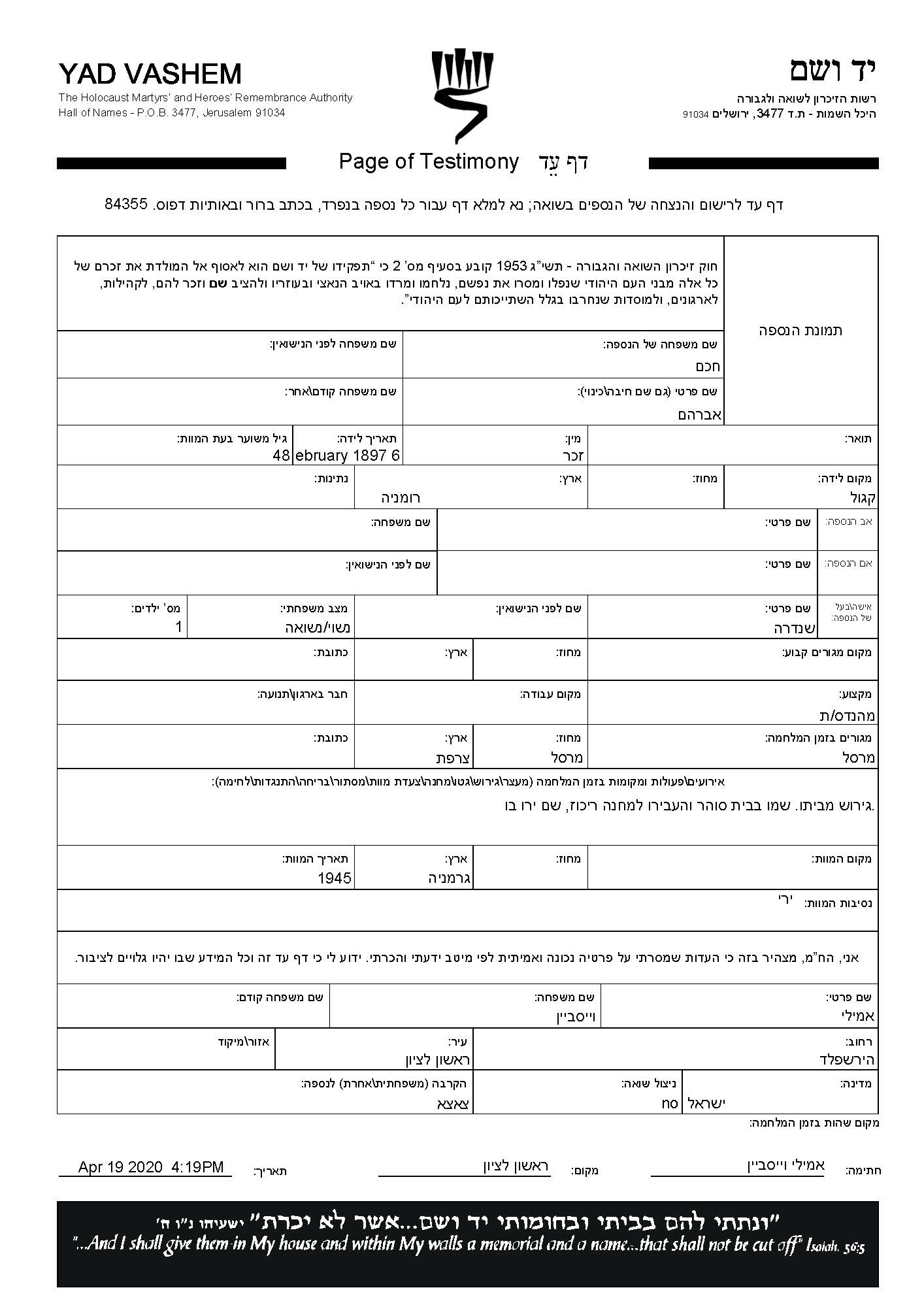 Avraham wurde in der Schoah ermordet. Todesort: <> (<>), Deutsches Reich im Jahr 1945.