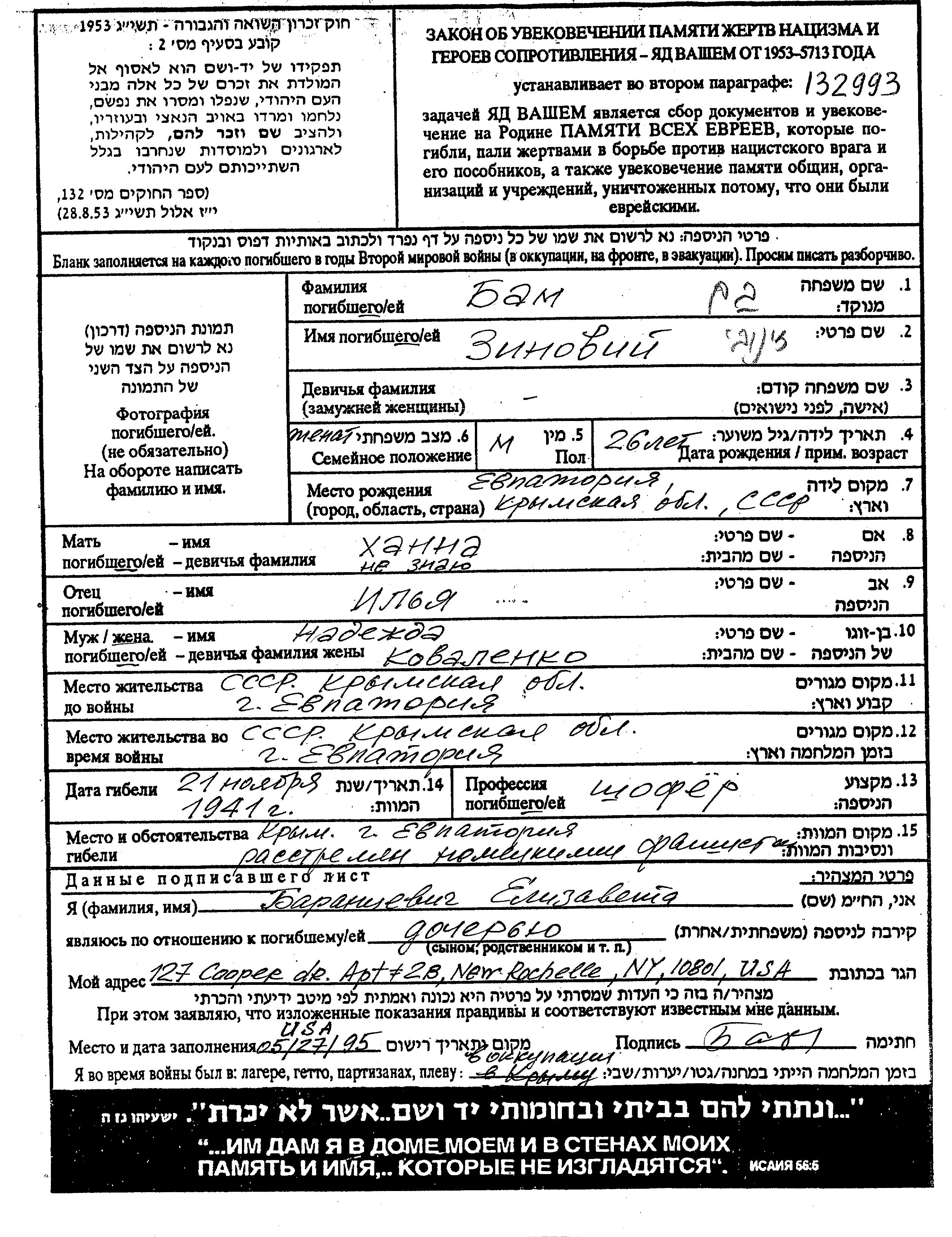 Zinovi Bam wurde im Jahr 1915 in Yevpatoriya, Russland (UdSSR) geboren. Er war Chauffeur. Vor dem Zweiten Weltkrieg lebte er in Yevpatoriya, Russland (UdSSR).