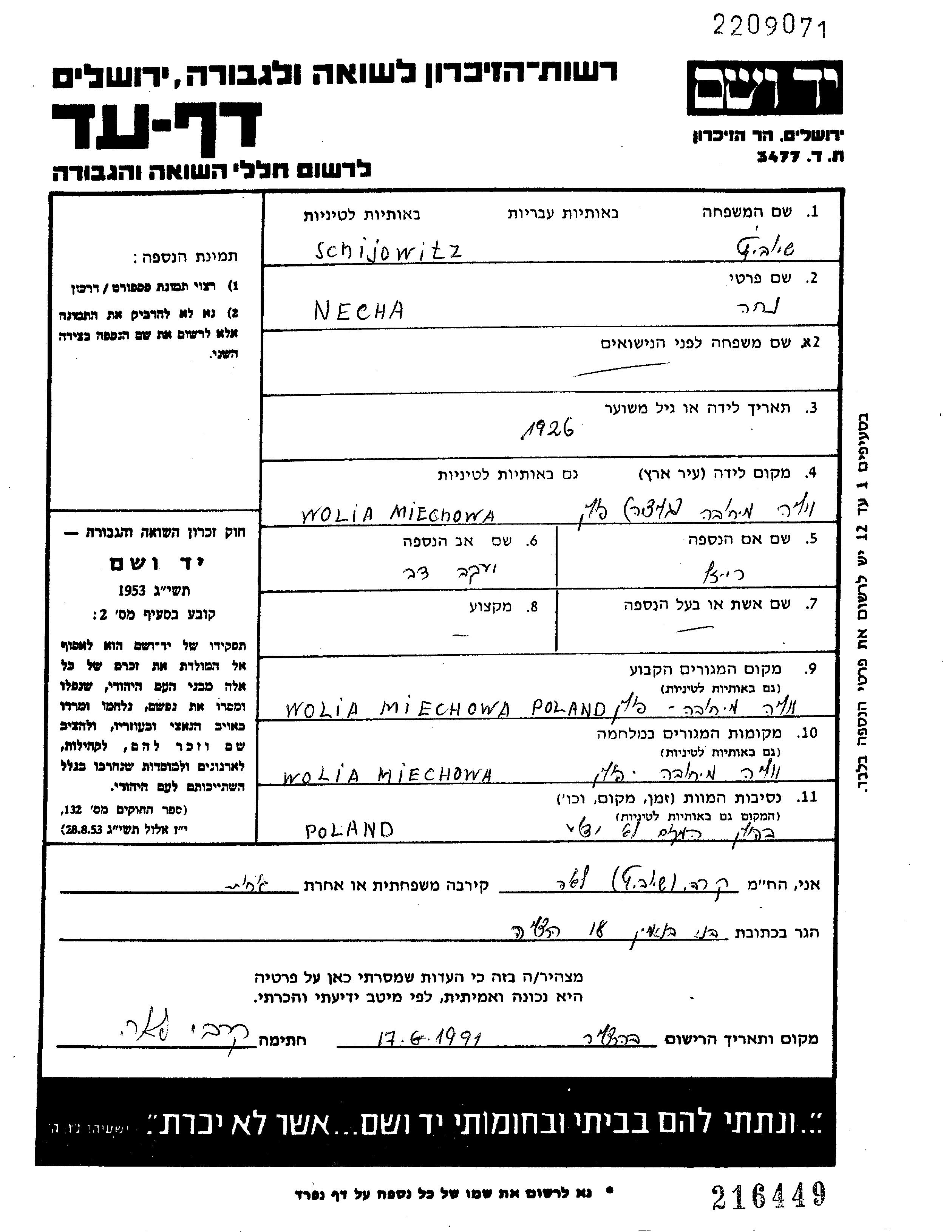 Necha Schijowitz wurde in Wola Michowa, Polen geboren. Sie war die Tochter von Jakow Dow und Rejzl, geb. Rand. Sie war Ledig. Vor dem Zweiten Weltkrieg lebte sie in Wola Michowa, Polen. Während des Krieges war sie in Wola Michowa, Polen.