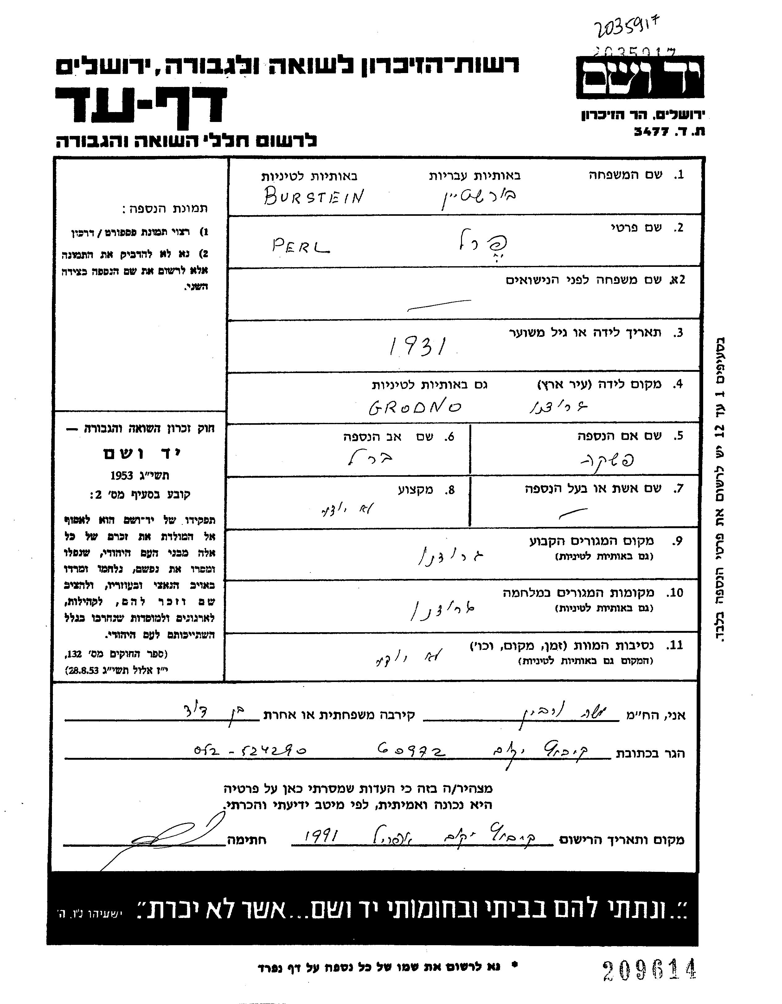 Perl Burstein wurde im Jahr 1931 in Grodno, Polen geboren. Sie war die Tochter von Berl und Peshka Peshka. Vor dem Zweiten Weltkrieg lebte sie in Grodno, Polen. Während des Krieges war sie in Grodno, Polen.