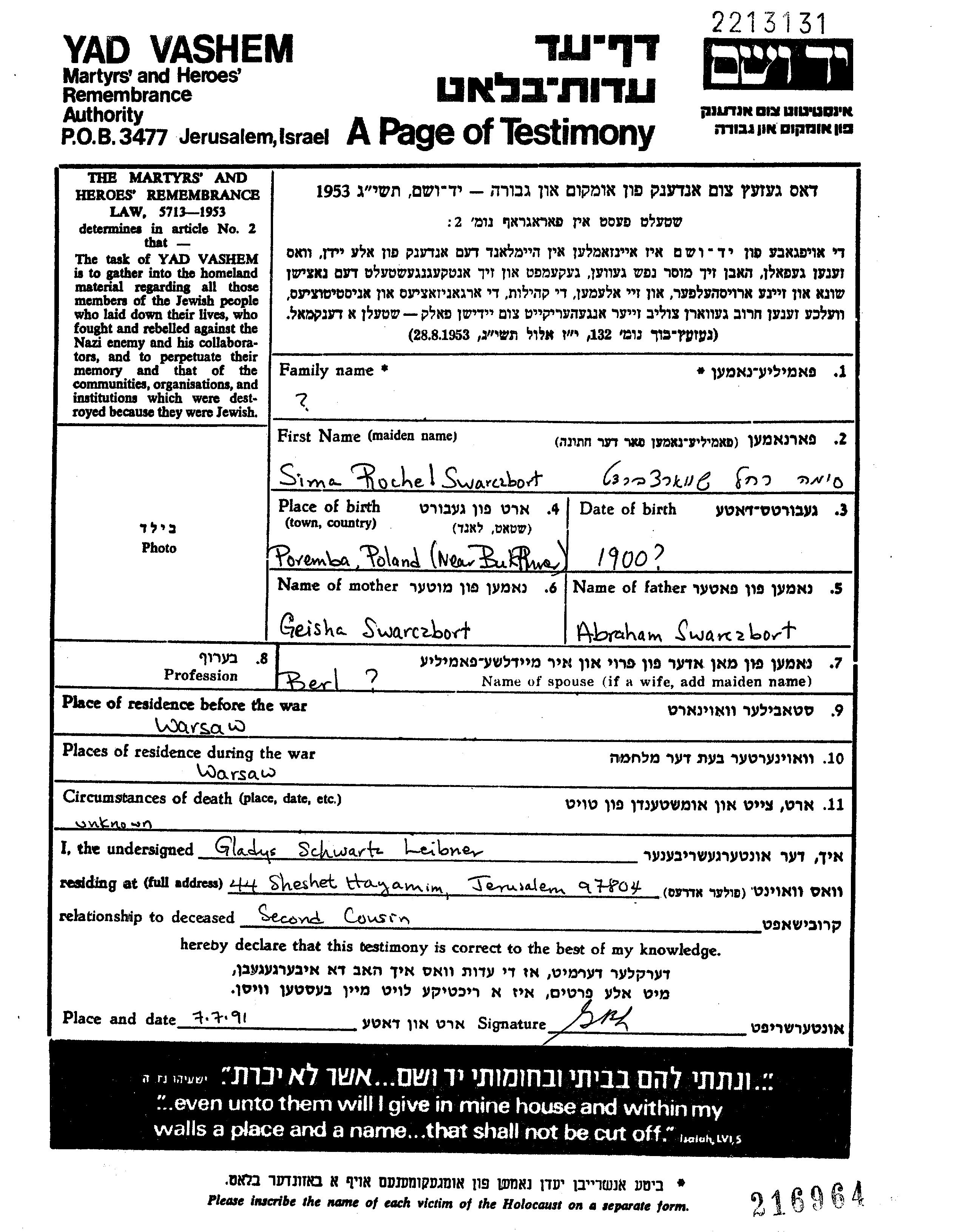 Rochel Sima Name unbekannt, geb. Swarczbort wurde im Jahr 1900 in Poreba, Polen geboren. Sie war die Tochter von Abraham und Geisha. Sie war mit Berl Verheiratet. Vor dem Zweiten Weltkrieg lebte sie in Warszawa, Polen. Während des Krieges war sie in Warszawa, Polen.