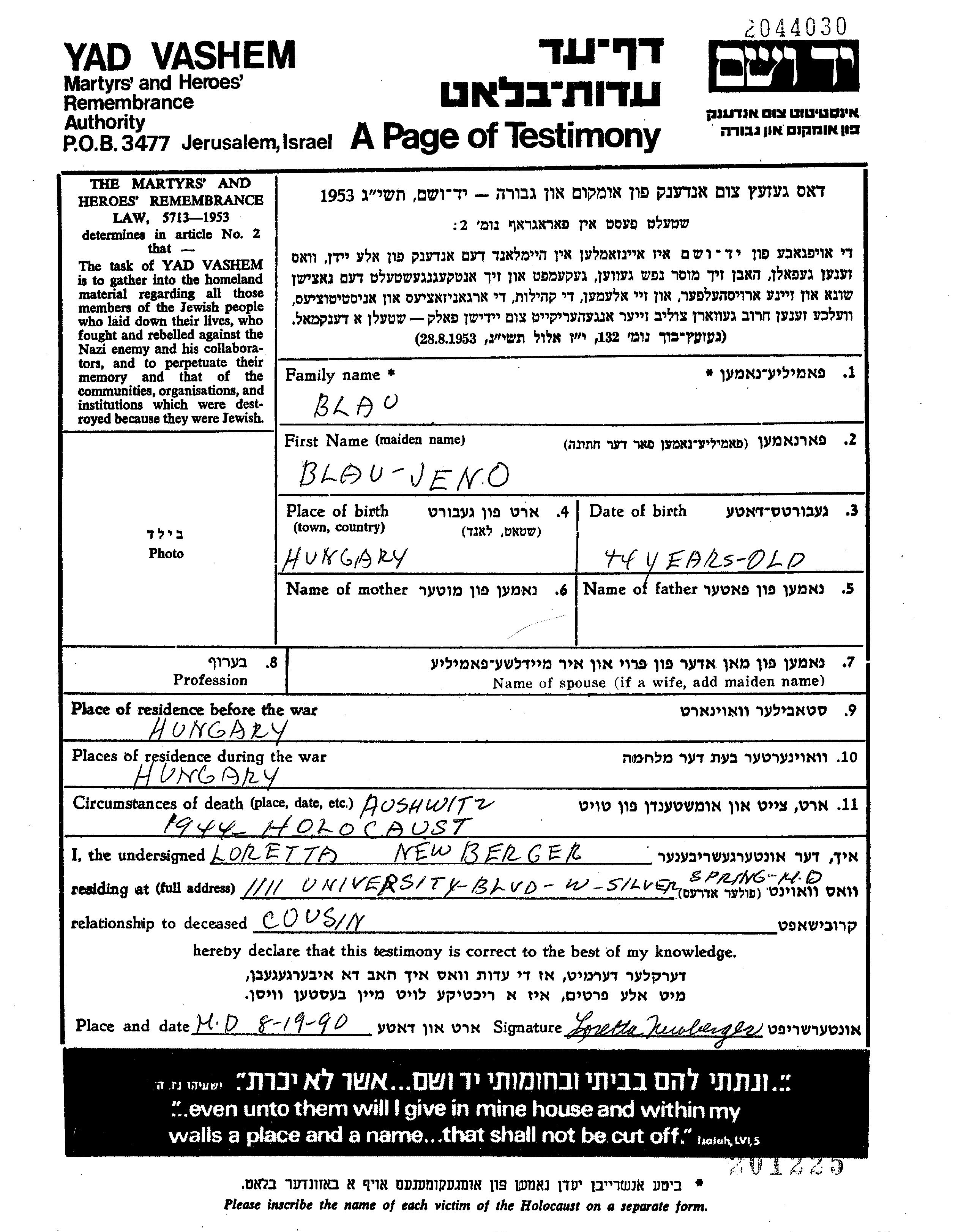 Jeno Blau wurde im Jahr 1900 in Ungarn geboren. Vor dem Zweiten Weltkrieg lebte er in Ungarn. Während des Krieges war er in Ungarn.