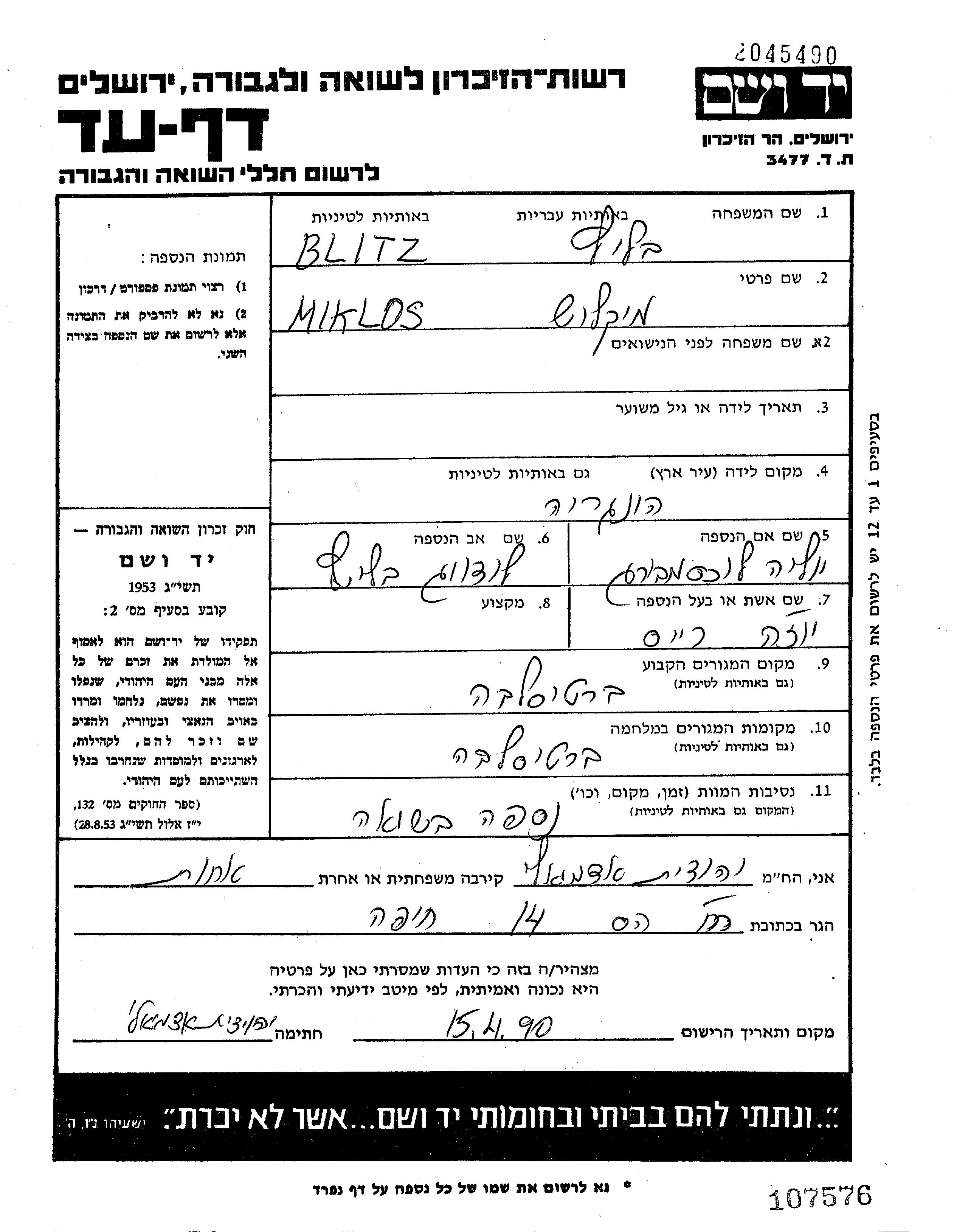 Miklos Blitz wurde in Ungarn geboren. Er war der Sohn von Ludvig und Julia, geb. Luksemburg. Er war mit Yuzha Iozha Verheiratet. Vor dem Zweiten Weltkrieg lebte er in Bratislava, Tschechoslowakei. Während des Krieges war er in Bratislava, Tschechoslowakei.