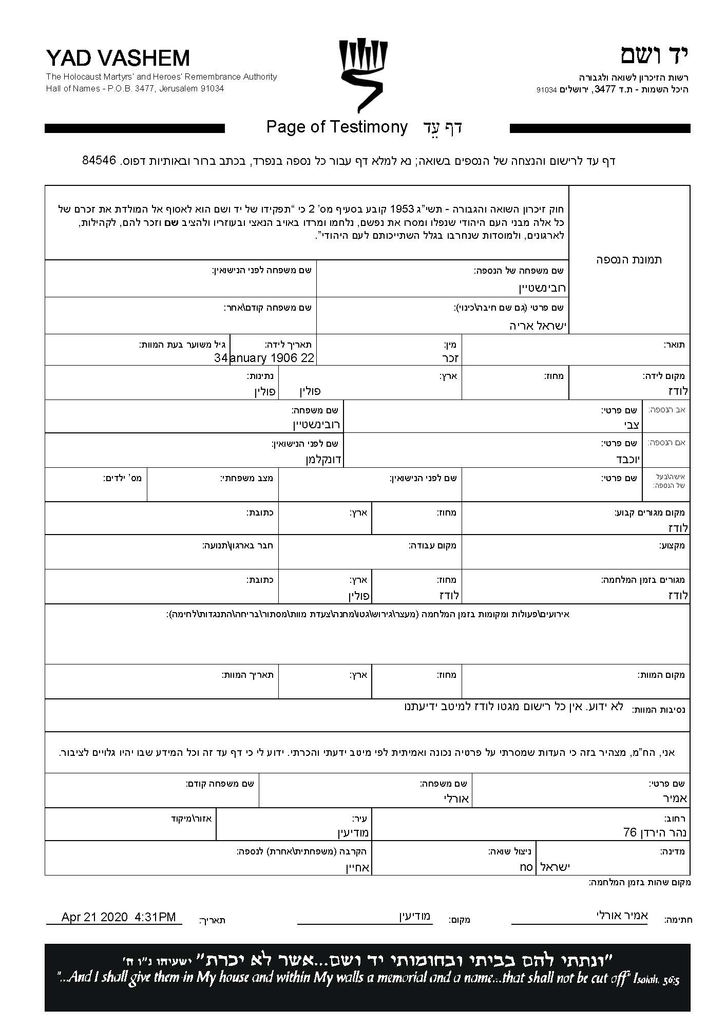 Israel Arie Rubinshtein wurde im Jahr 1906 in Łódź, Polen geboren. Er war der Sohn von Tzvi und Yokheved, geb. Dunkelman. Vor dem Zweiten Weltkrieg lebte er in Łódź, Polen. Während des Krieges war er in Łódź, Polen.