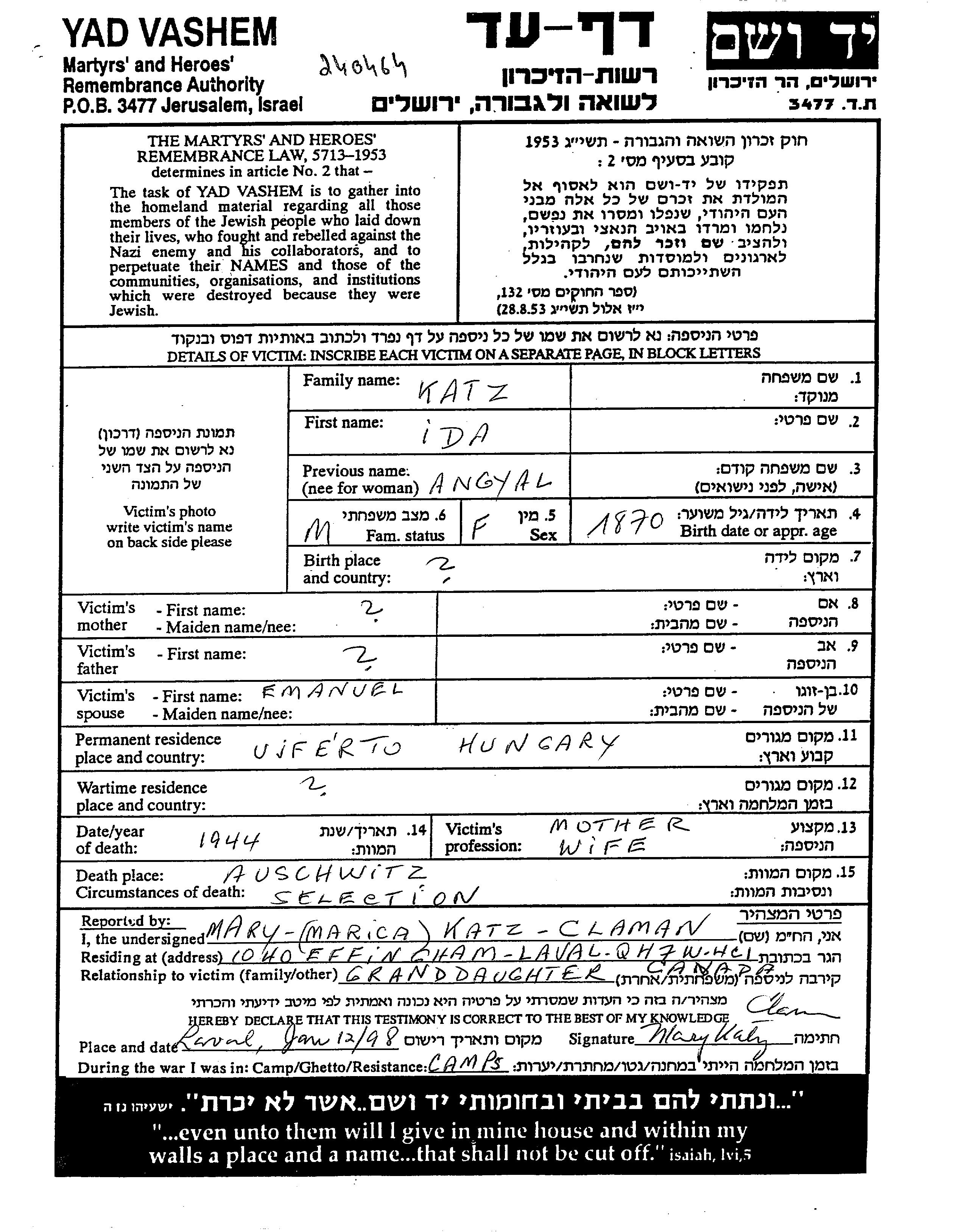 Ida Katz, geb. Angyal wurde in Ungarn geboren. Sie war Hausfrau. Vor dem Zweiten Weltkrieg lebte sie in Ujfeherto, Ungarn.