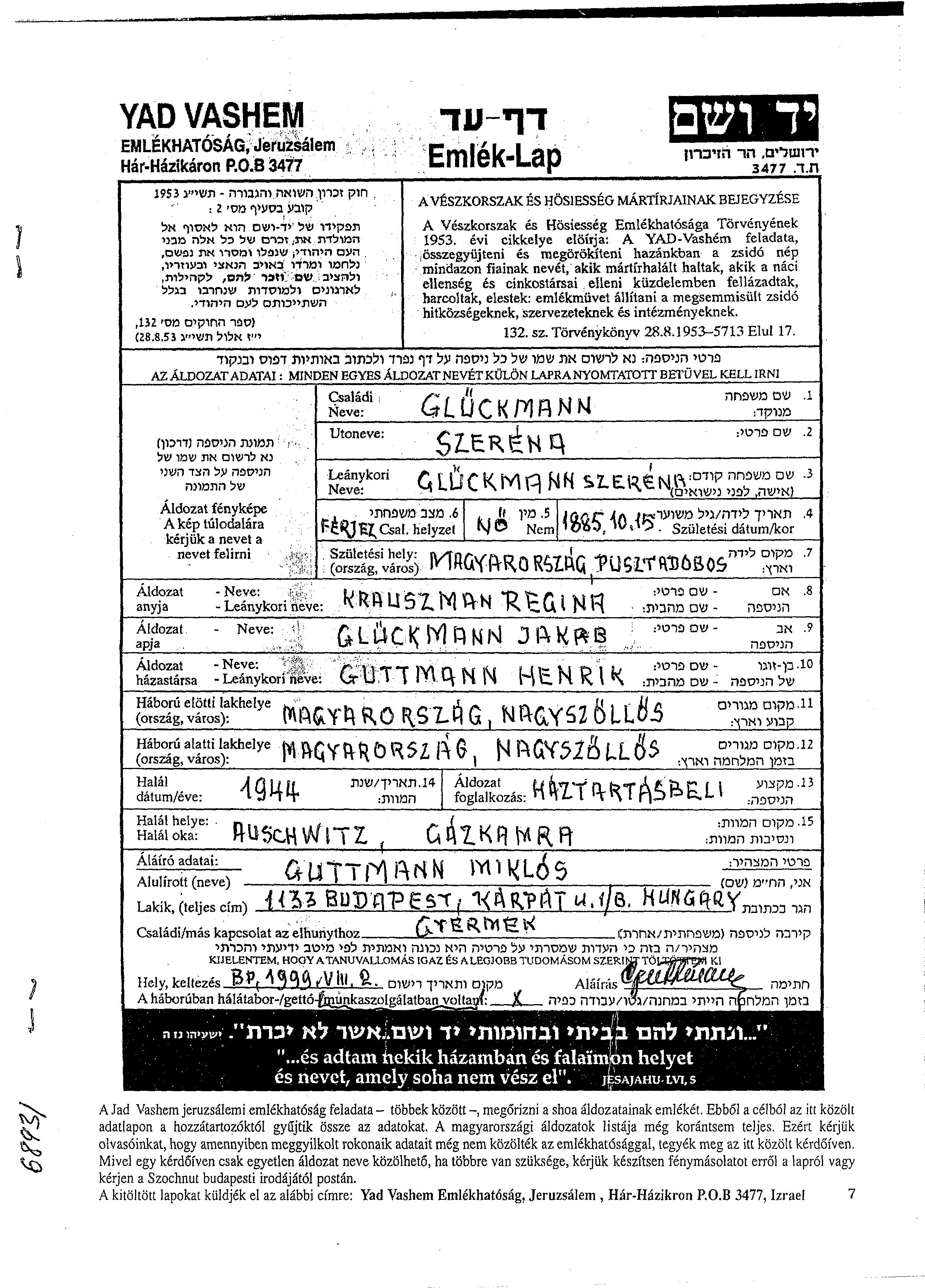 Guttmann Szerena 1885 Nagyszollos, Tschechoslowakei Gedenkblatt
