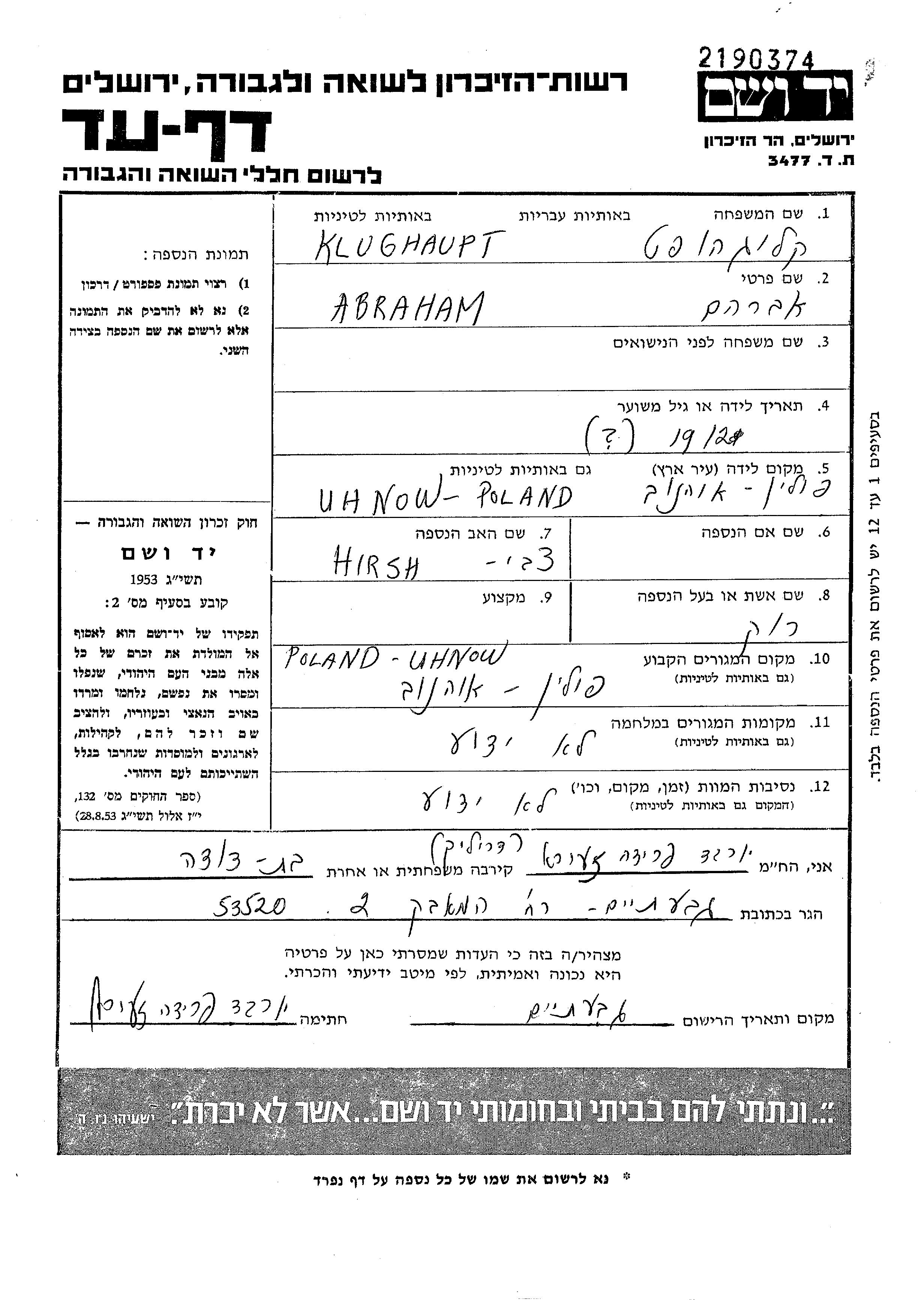 Abraham Klughaupt wurde im Jahr 1912 in Uhnow, Polen geboren. Vor dem Zweiten Weltkrieg lebte er in Uhnow, Polen.