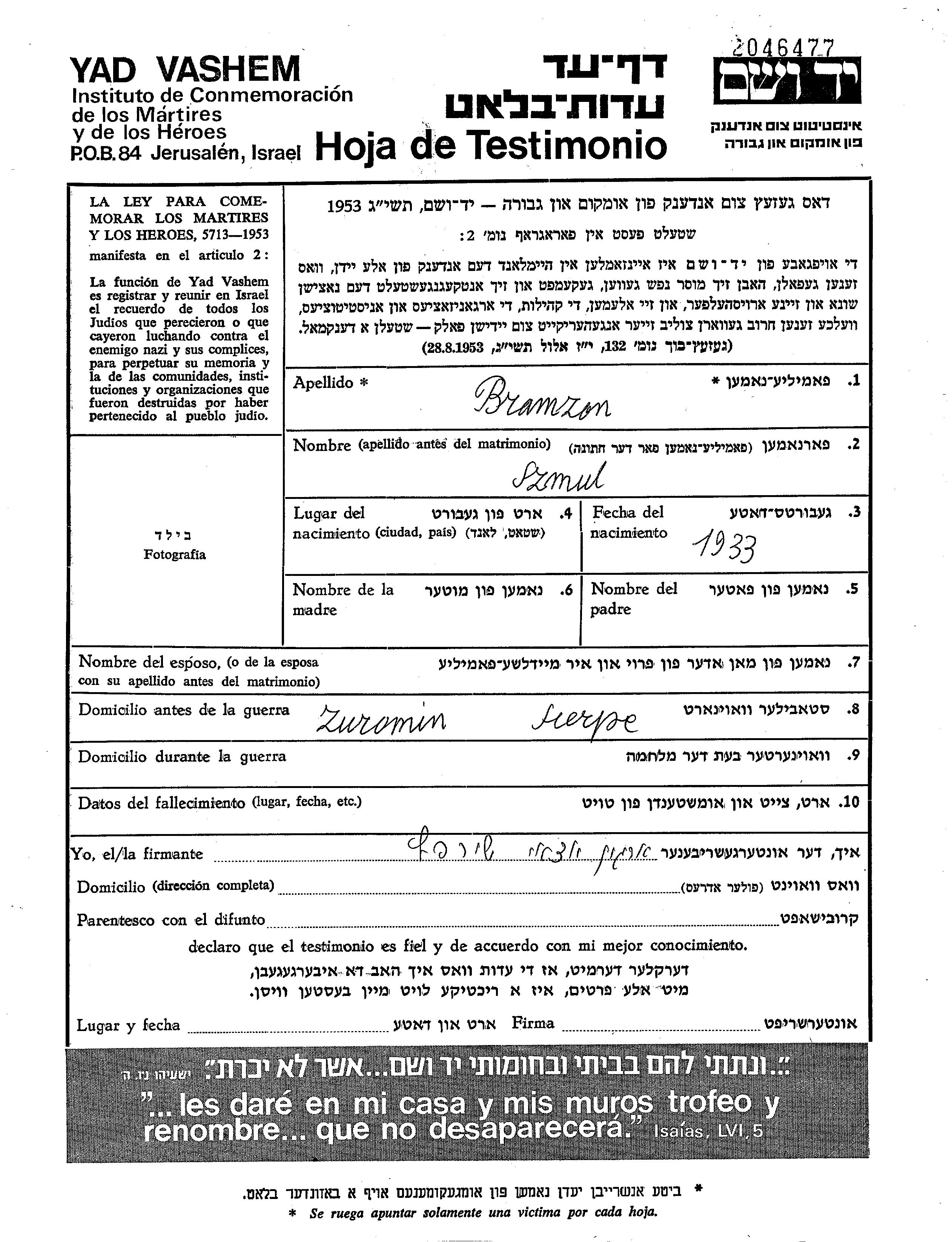 Szmul Bramzon wurde im Jahr 1933 geboren. Er war Kind. Vor dem Zweiten Weltkrieg lebte er in Zuromin, Polen. Während des Krieges war er in Polen.
