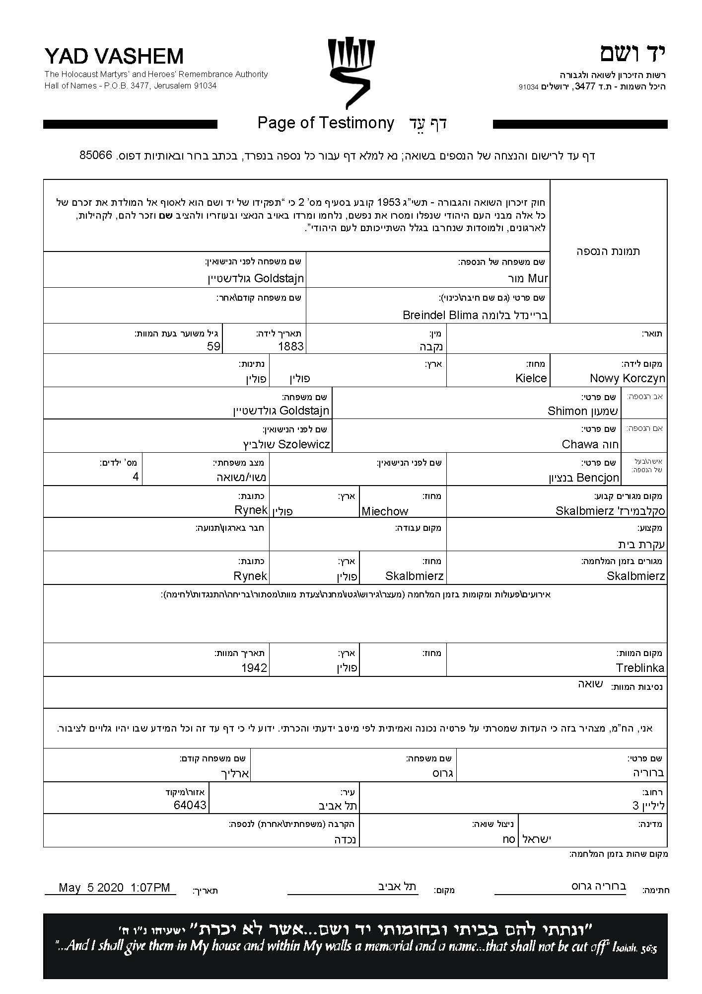 Breindel Blima Mur, geb. Goldstajn wurde im Jahr 1883 in Nowy Korczyn, Polen geboren. Sie war die Tochter von Shimon und Chawa, geb. Szolewicz Shulevitz. Sie war Hausfrau und mit Bencjon Verheiratet. Vor dem Zweiten Weltkrieg lebte sie in Skalbmierz, Polen. Während des Krieges war sie in Skalbmierz, Polen.