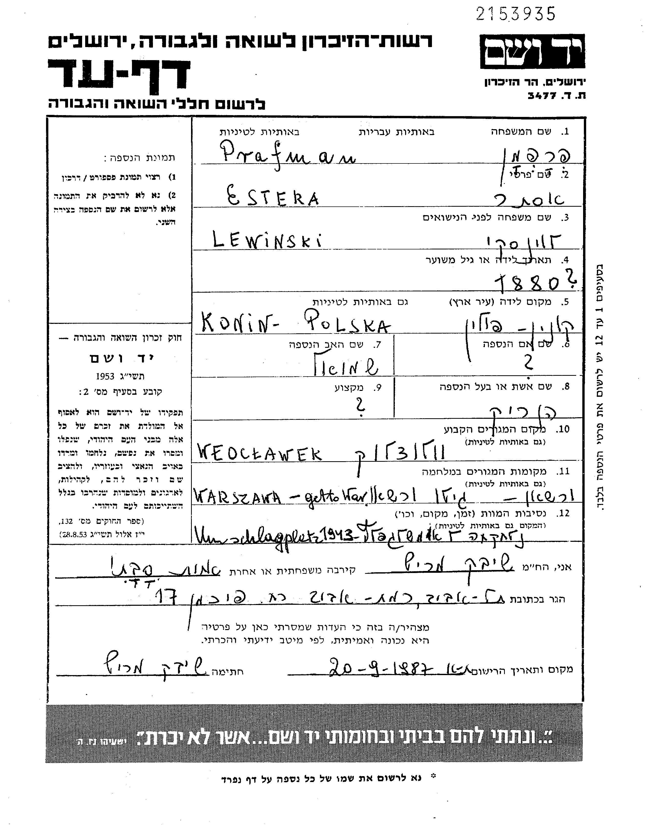 Estera Prafman, geb. Lewinski wurde in Konin, Polen geboren. Vor dem Zweiten Weltkrieg lebte sie in Wloclawek, Polen.