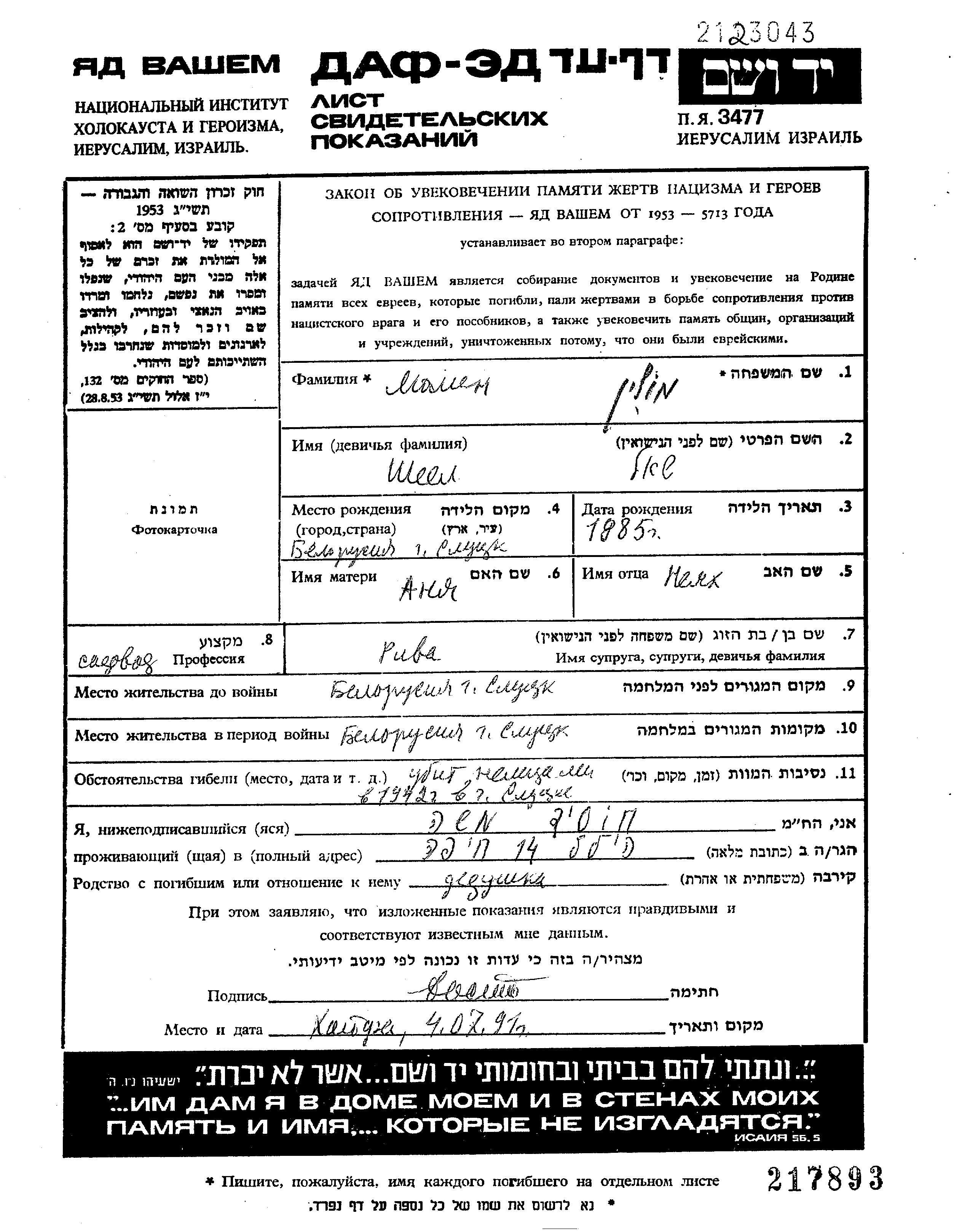 Sheyel wurde in der Schoah ermordet. Todesort: Slutsk, Weißrussland (UdSSR) im Jahr 1942.