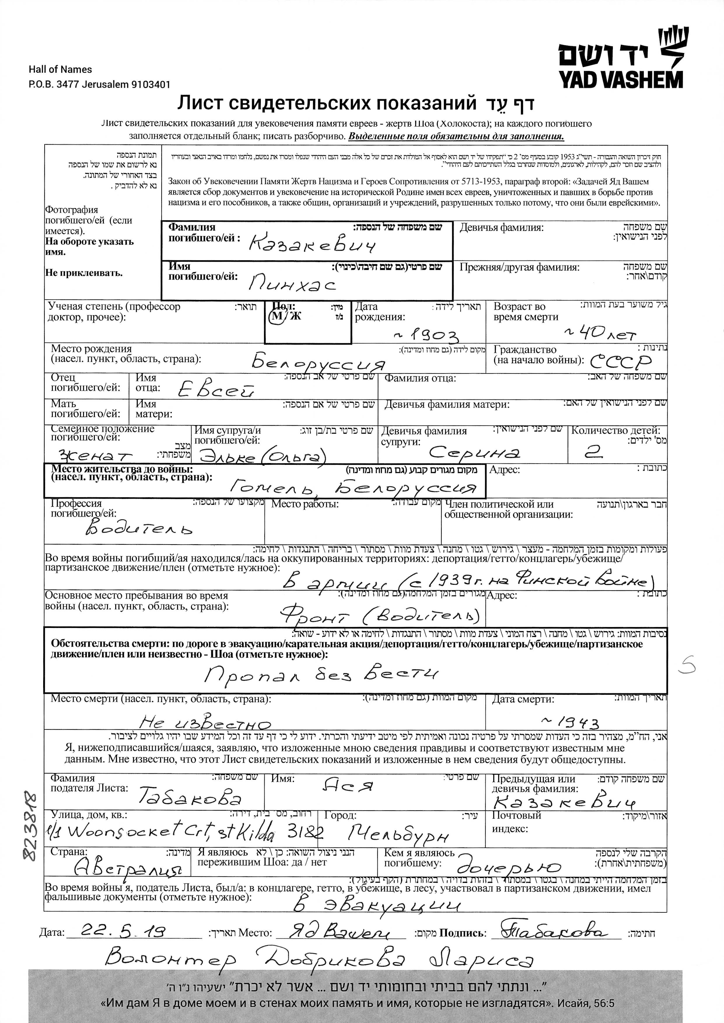 Pinkhas Kazakevich wurde im Jahr 1903 in Weißrussland (UdSSR) geboren. Er war der Sohn von Yevsey. Er war Chauffeur und mit Elke Olga, geb. Serina Verheiratet. Vor dem Zweiten Weltkrieg lebte er in Gomel, Weißrussland (UdSSR). Während des Krieges war er in die Sowjetischen Streitkräfte.