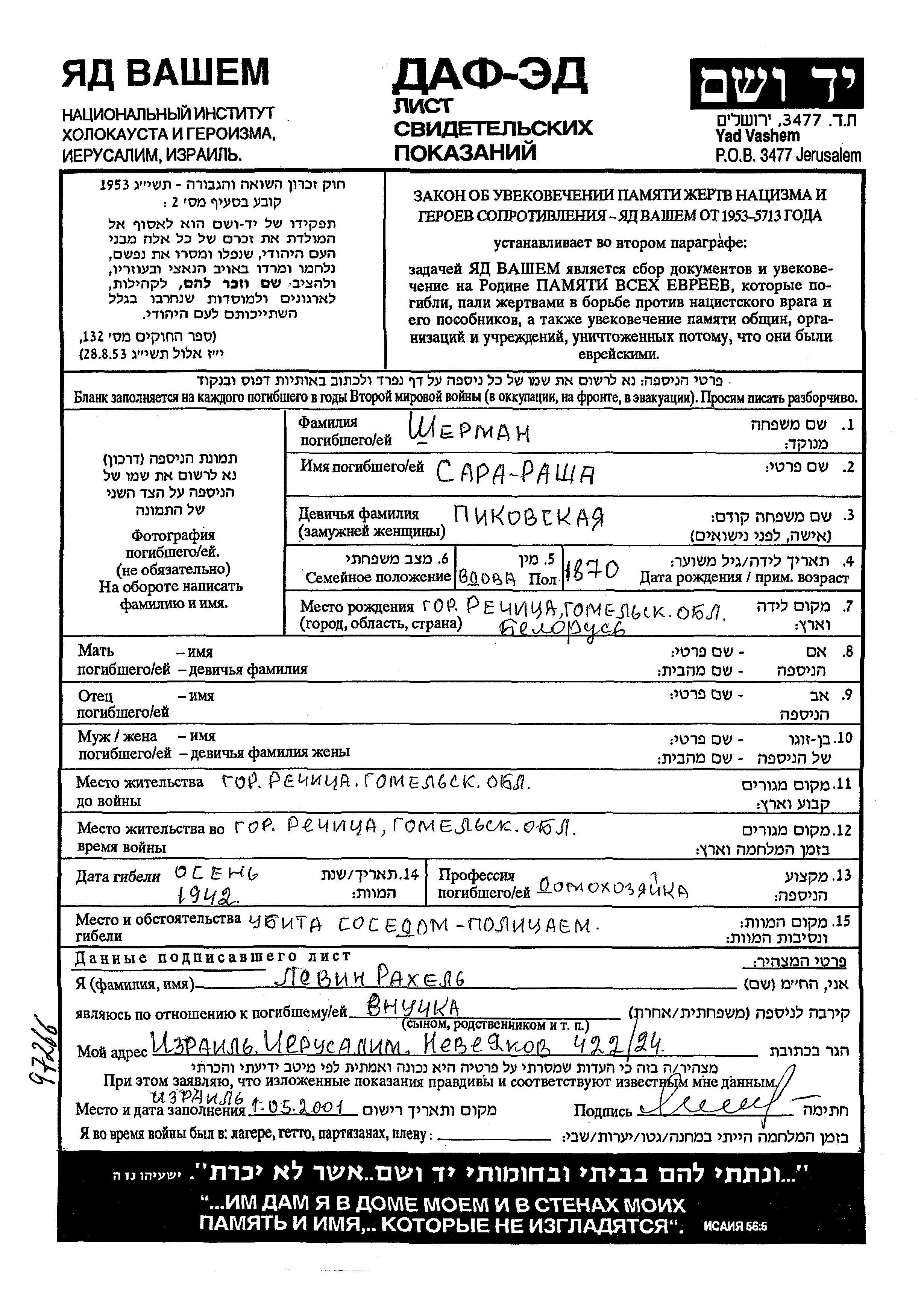 Sara Rasha Sherman, geb. Pikovskaya wurde im Jahr 1870 in Rechitsa, Weißrussland (UdSSR) geboren. Sie war Hausfrau. Vor dem Zweiten Weltkrieg lebte sie in Rechitsa, Weißrussland (UdSSR).