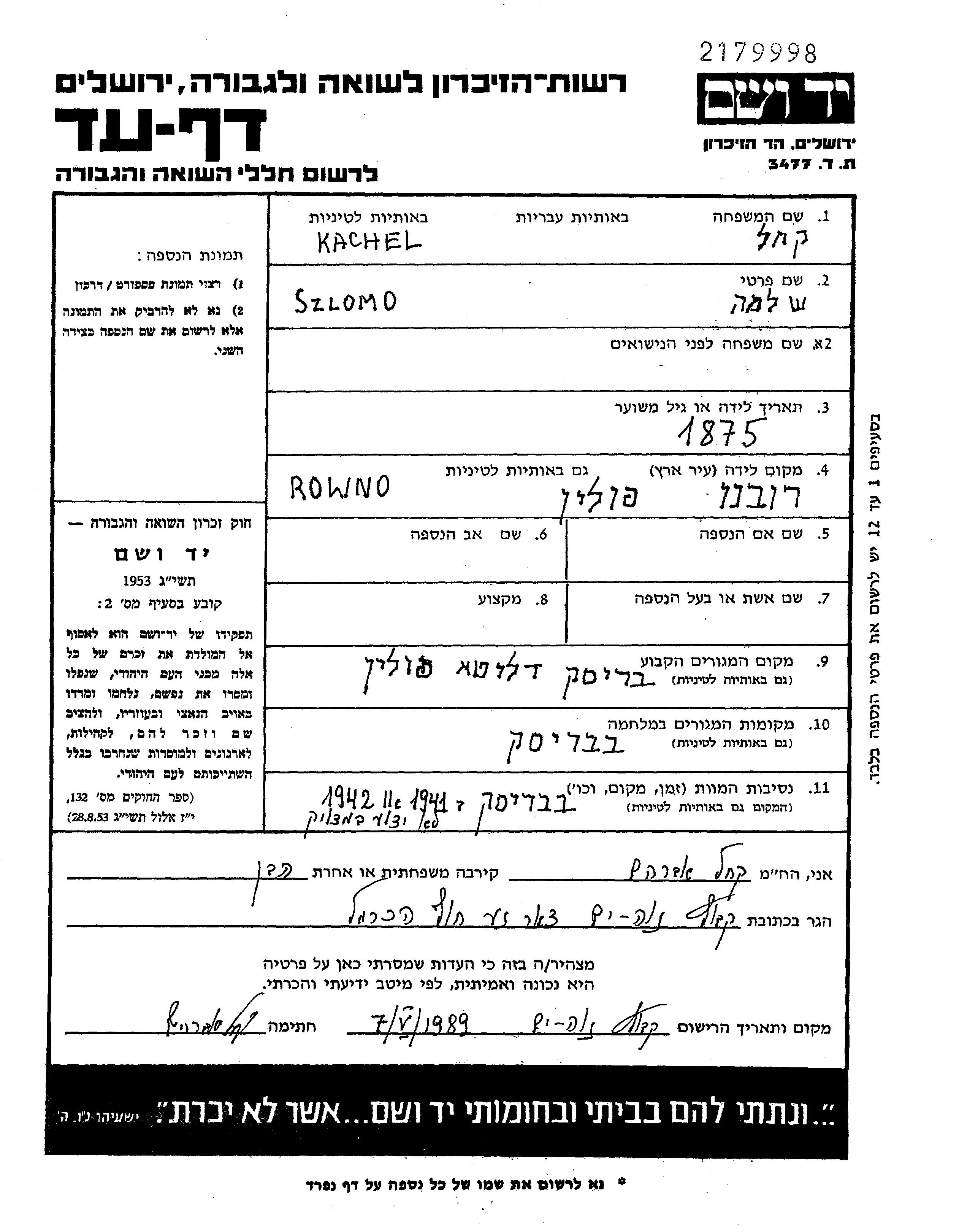 Szloma Kachel wurde in Rowno, Polen geboren. Er war Kaufmann/-frau. Vor dem Zweiten Weltkrieg lebte er in Brest Litowsk, Polen.