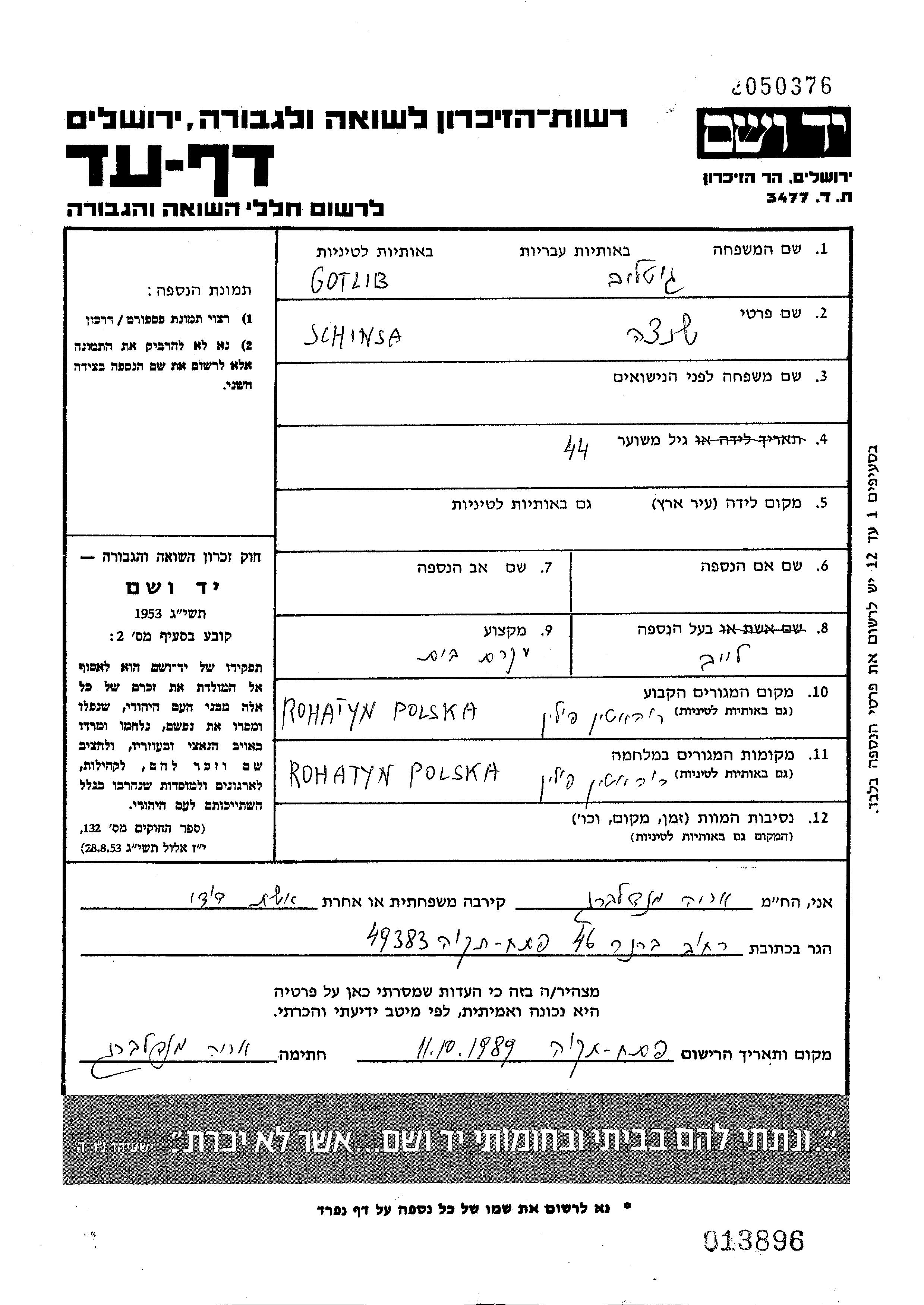 Schinsa Gotlib. Sie war Hausfrau und mit Leib Verheiratet. Vor dem Zweiten Weltkrieg lebte sie in Rohatyn, Polen. Während des Krieges war sie in Rohatyn, Polen.