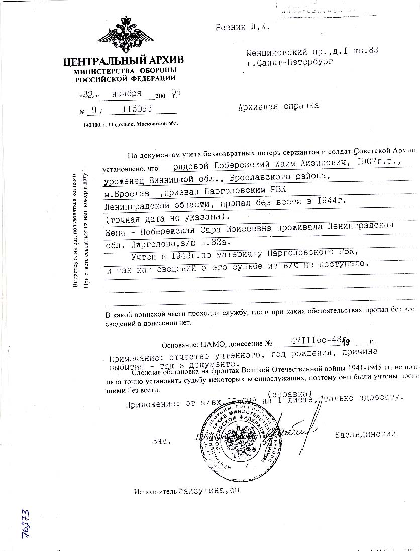 Khaim im Militärdienst umgekommen. Todesort: unbekannt im Jahr 1941.