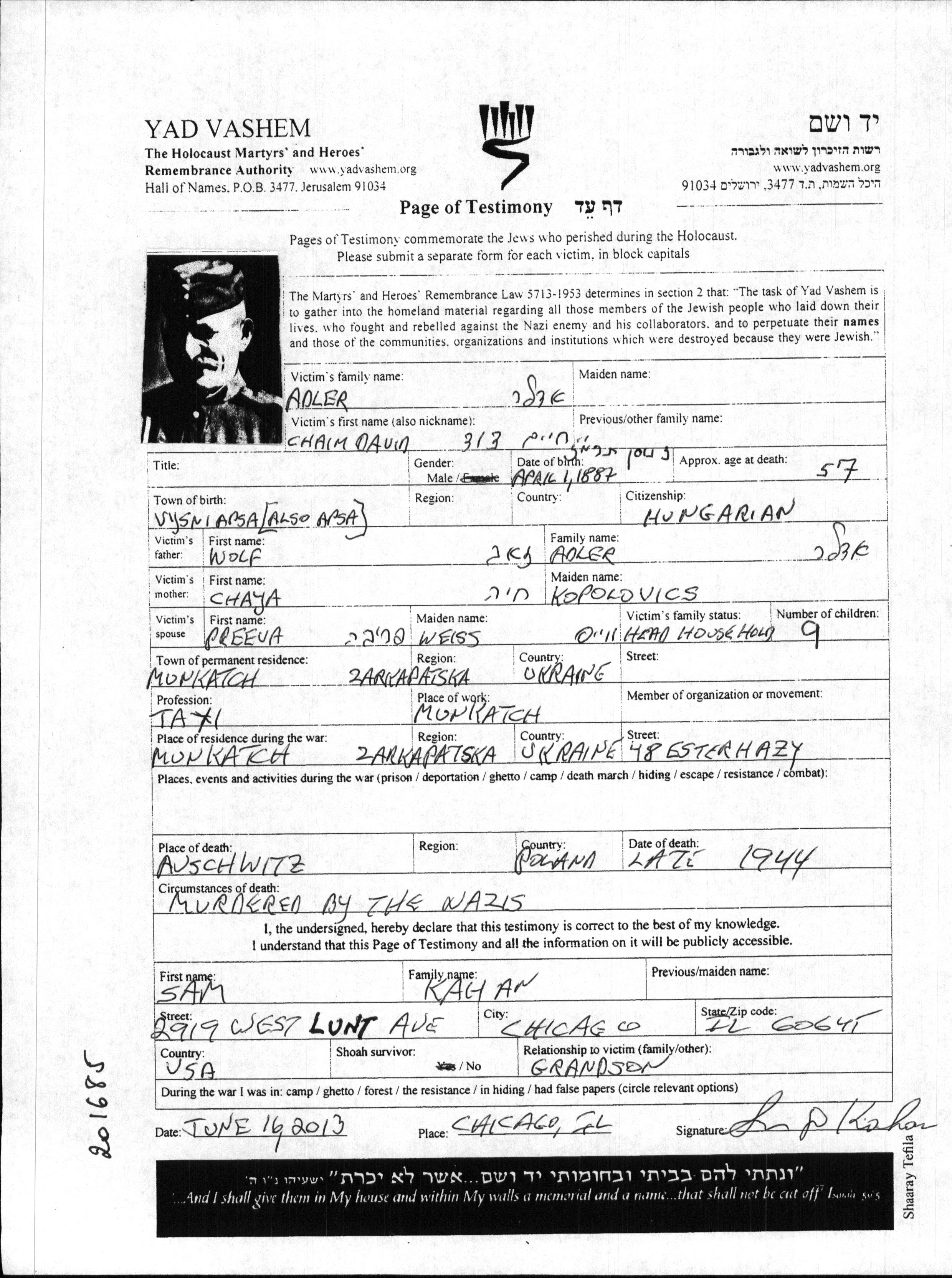 Adler | Chaim David | 1887 | Munkacs, Tschechoslowakei | Gedenkblatt |