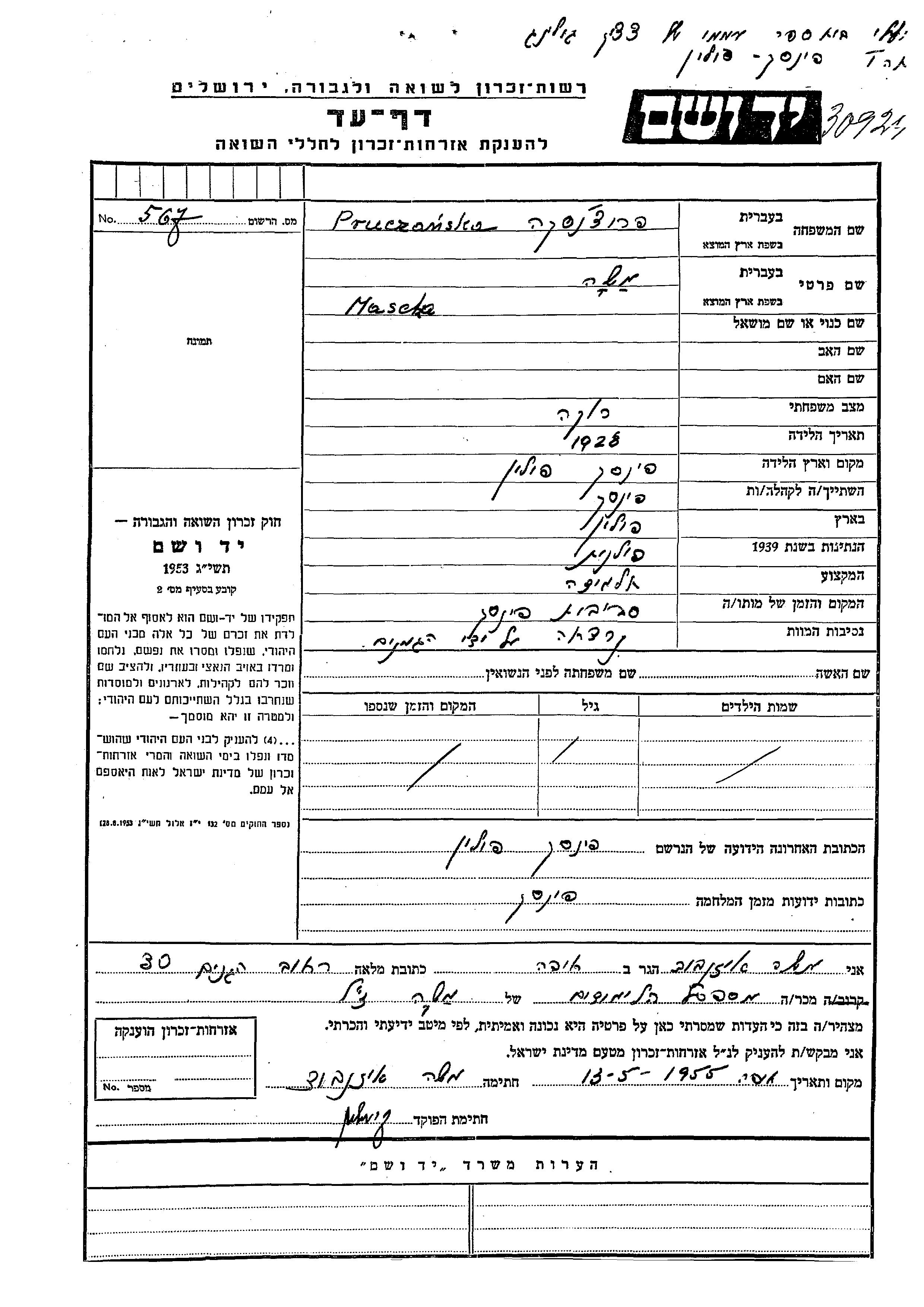 Pruchanskaya Masha 1927 Pinsk, Polen Verfolgtenliste