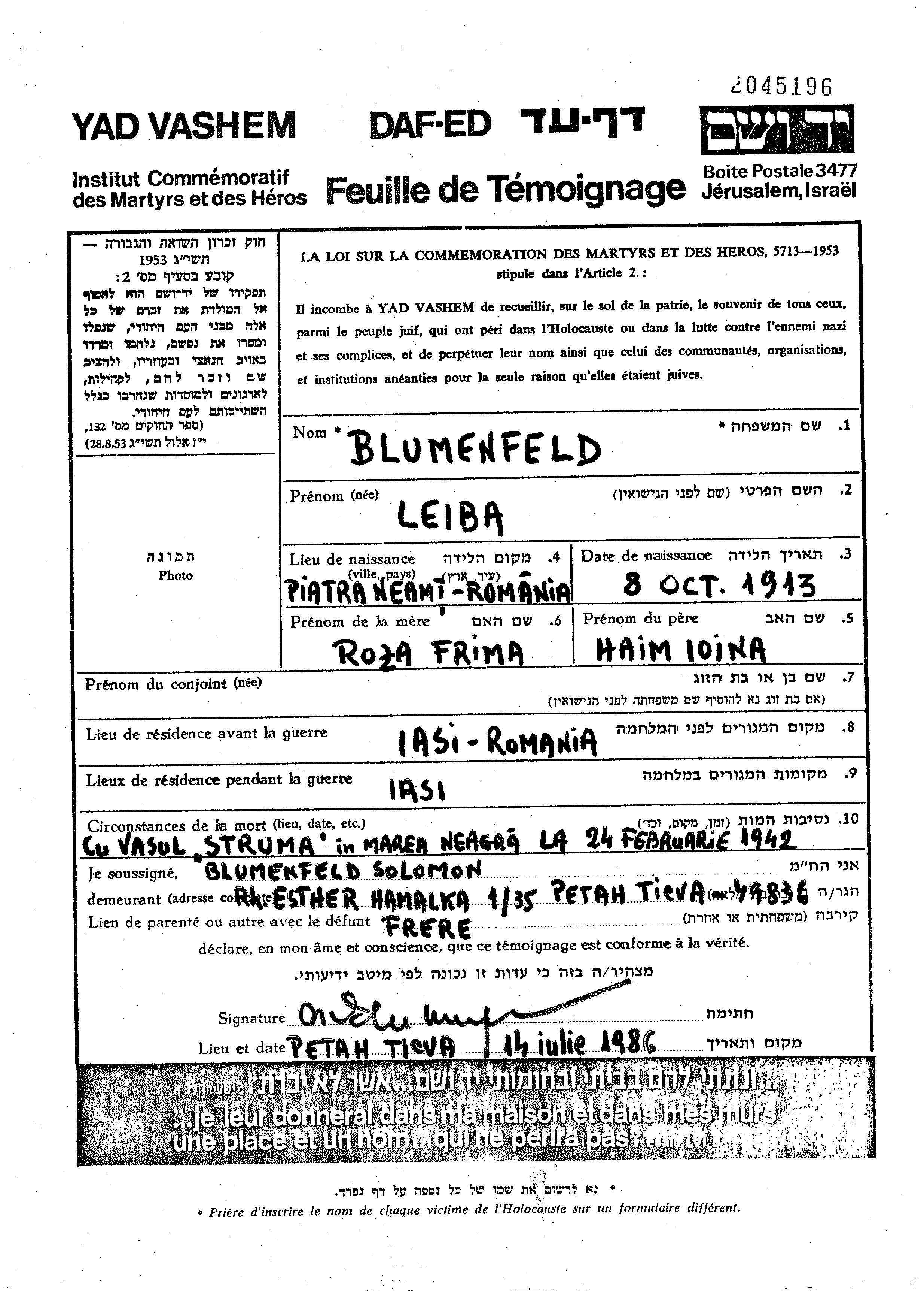 Leiba Blumenfeld wurde im Jahr 1913 in Piatra Neamt, Rumänien geboren. Er war der Sohn von Haim Ioina und Frima Roza. Vor dem Zweiten Weltkrieg lebte er in Iasi, Rumänien. Während des Krieges war er in Iasi, Rumänien.