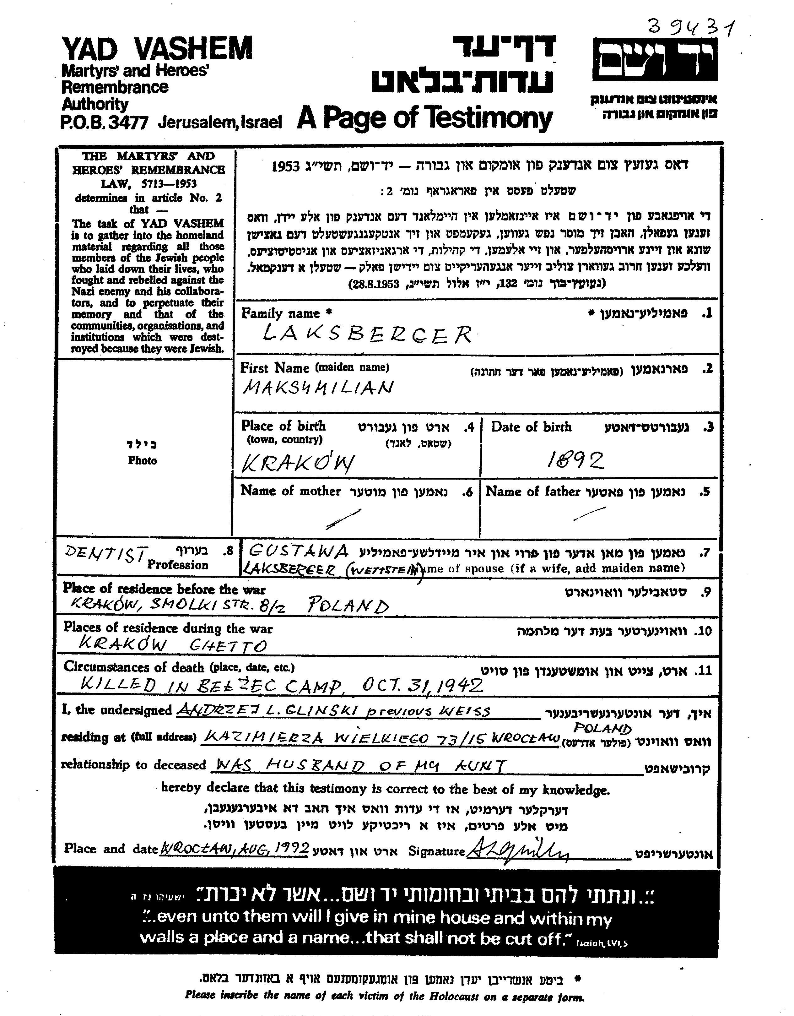 Maksymilian wurde in der Schoah ermordet. Todesort: Belzec, Polen im Jahr 31/10/1942.