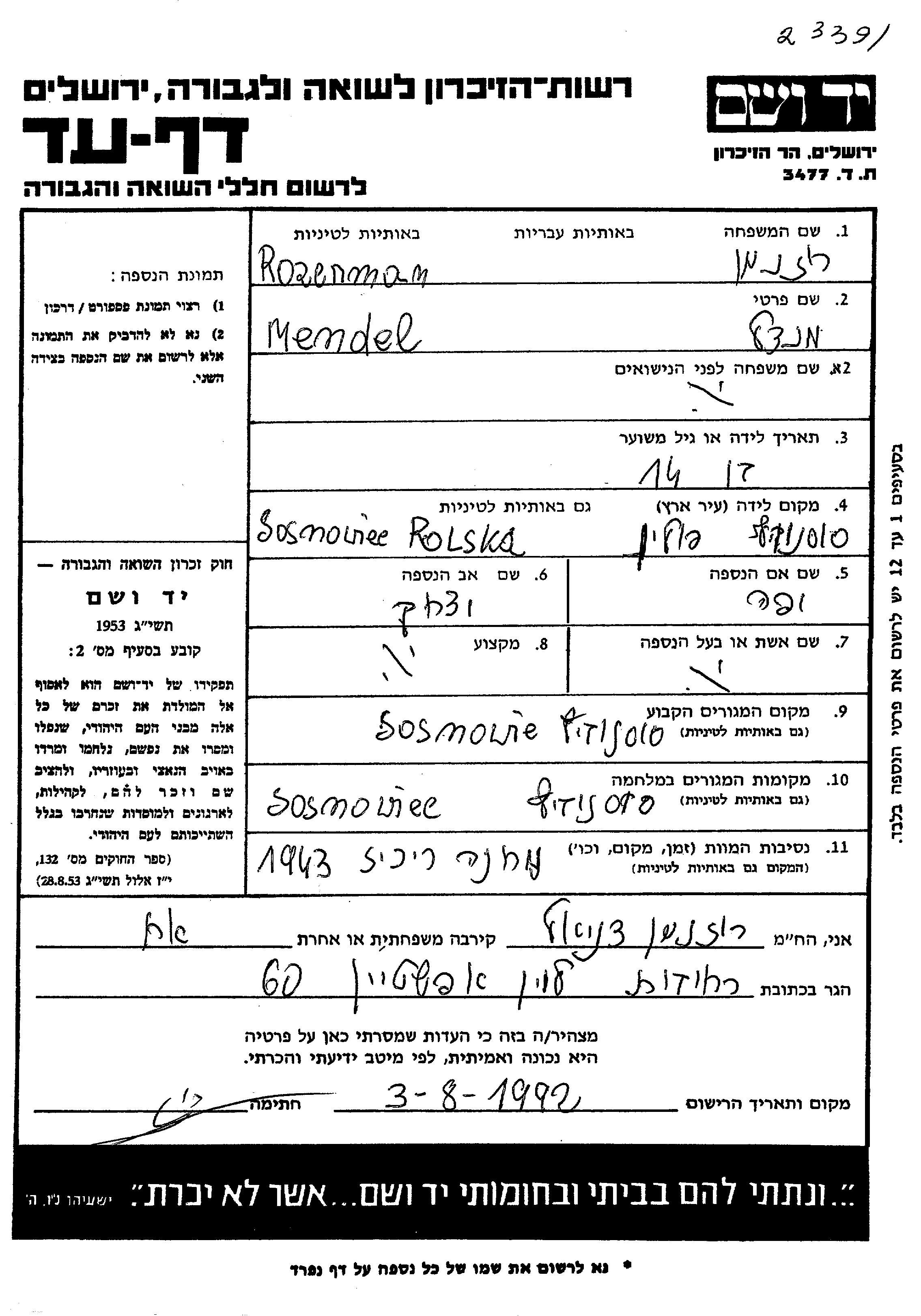 Rozenman Menahem Mendel 1925 Sosnovits, Polen Gedenkblatt