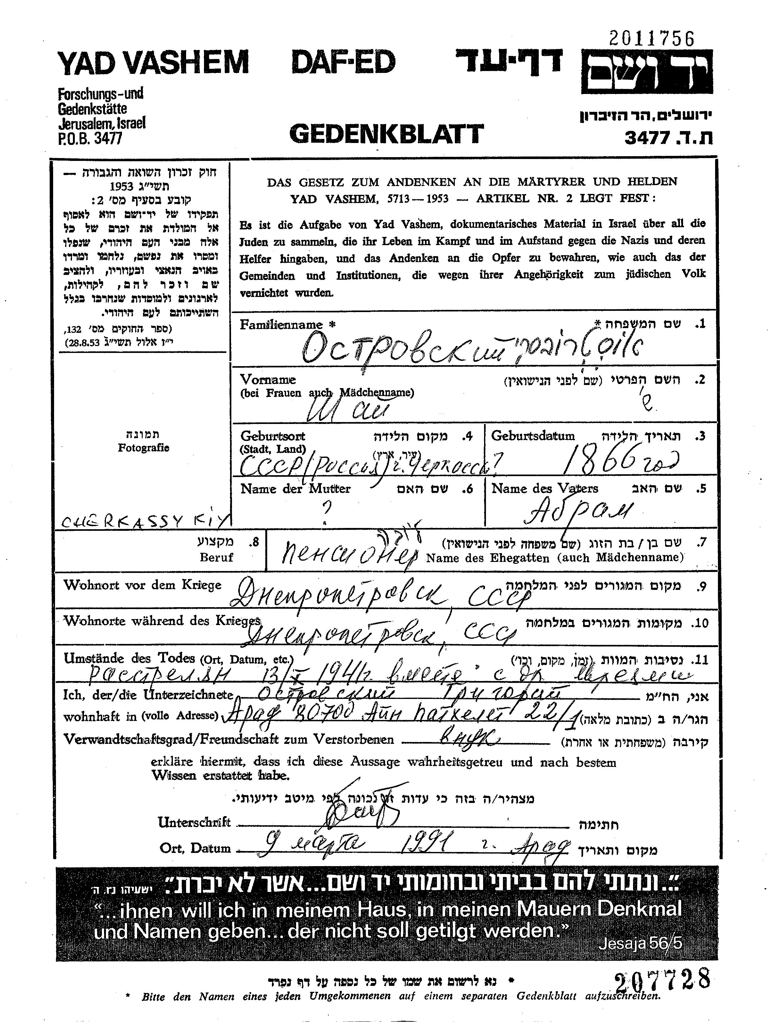 Shai Ostrovski wurde im Jahr 1866 in Cherkassy, Ukraine (UdSSR) geboren. Er war Rentner/-in. Vor dem Zweiten Weltkrieg lebte er in Dnepropetrovsk, Ukraine (UdSSR).