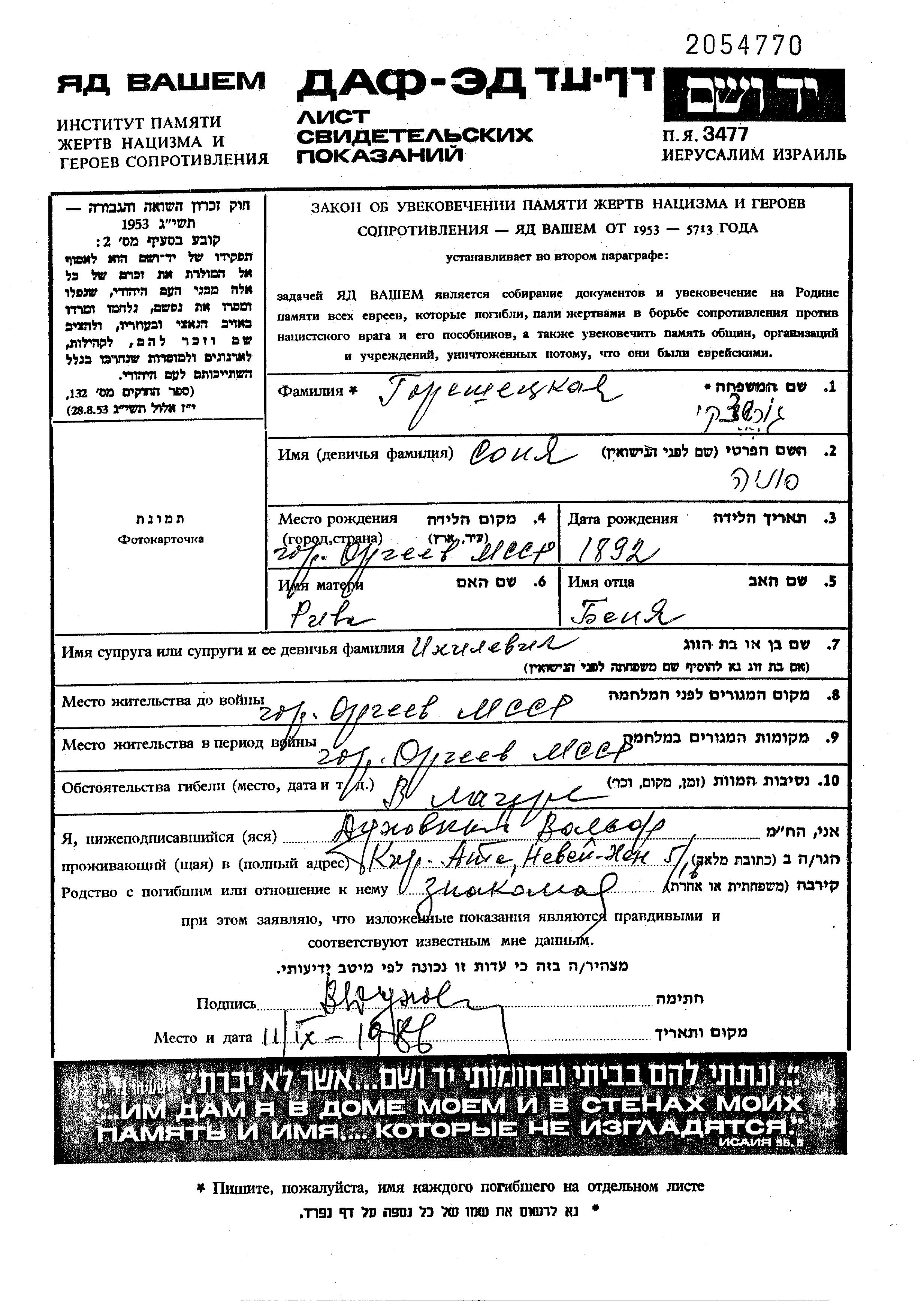 Sonia Goreshetzki, geb. Ikhilevich wurde in Orhei, Rumänien geboren. Sie war die Tochter von Benia Benya und Riva. Sie war mit Zisia Verheiratet. Vor dem Zweiten Weltkrieg lebte sie in Orhei, Rumänien. Während des Krieges war sie in Orhei, Rumänien.