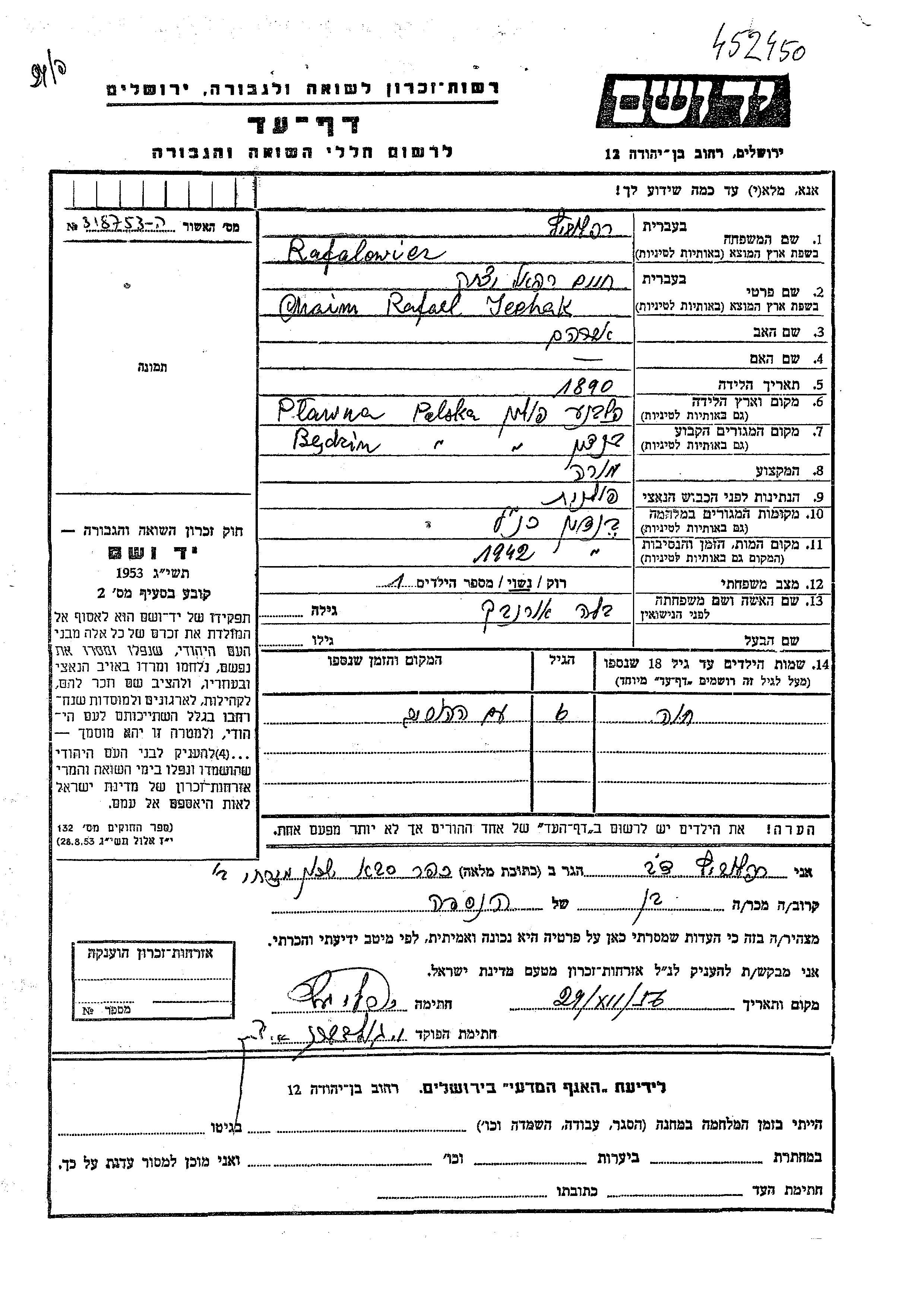 Khava Gela Rafalowicz wurde in unbekannter Ort geboren. Vor dem Zweiten Weltkrieg lebte sie in Będzin, Polen.