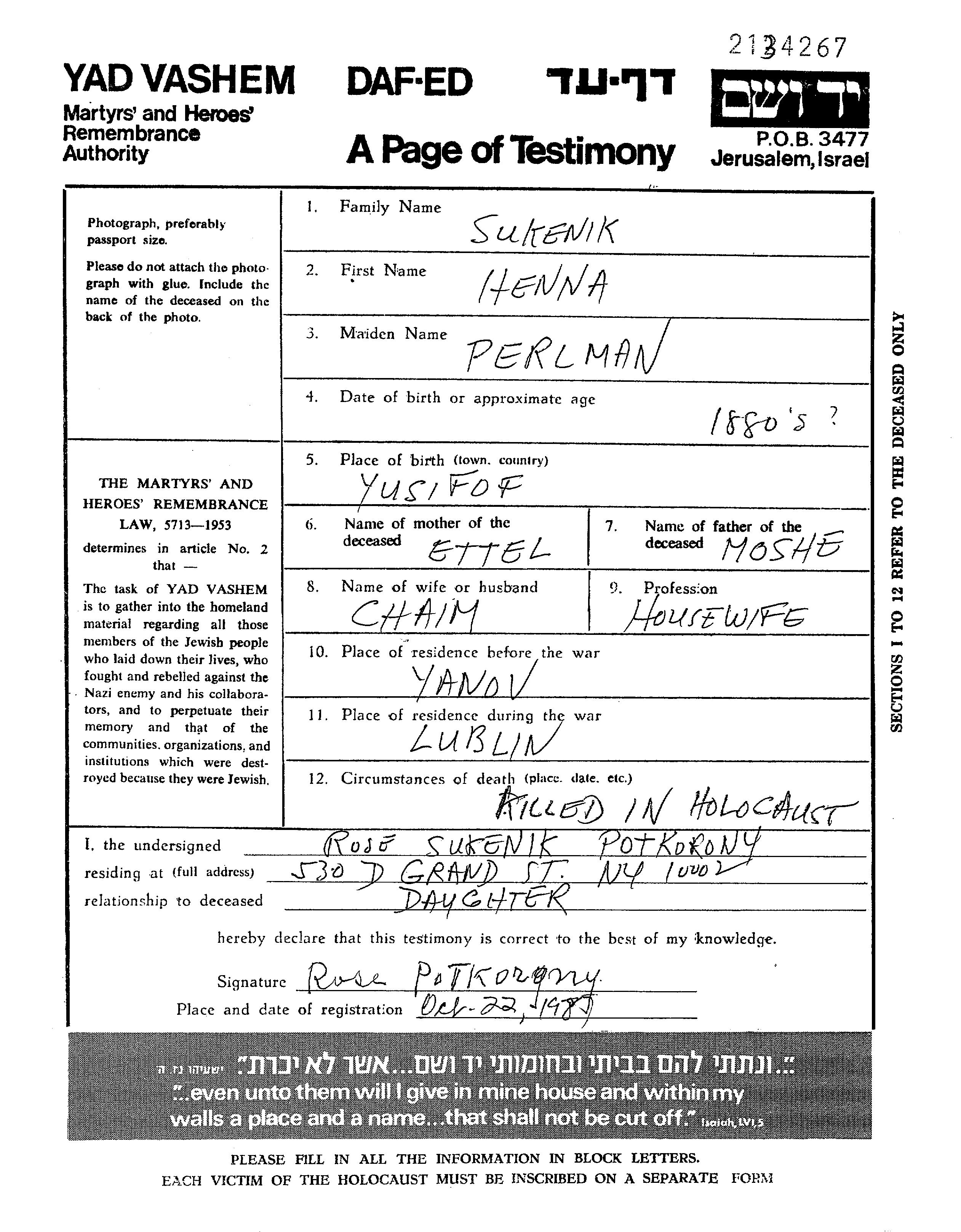 Henna Sukenik, geb. Perlman wurde in Jozefow, Polen geboren. Sie war die Tochter von Moshe und Ettel. Sie war mit Chaim Verheiratet. Vor dem Zweiten Weltkrieg lebte sie in Janow Lubelski, Polen. Während des Krieges war sie in Lublin, Polen.