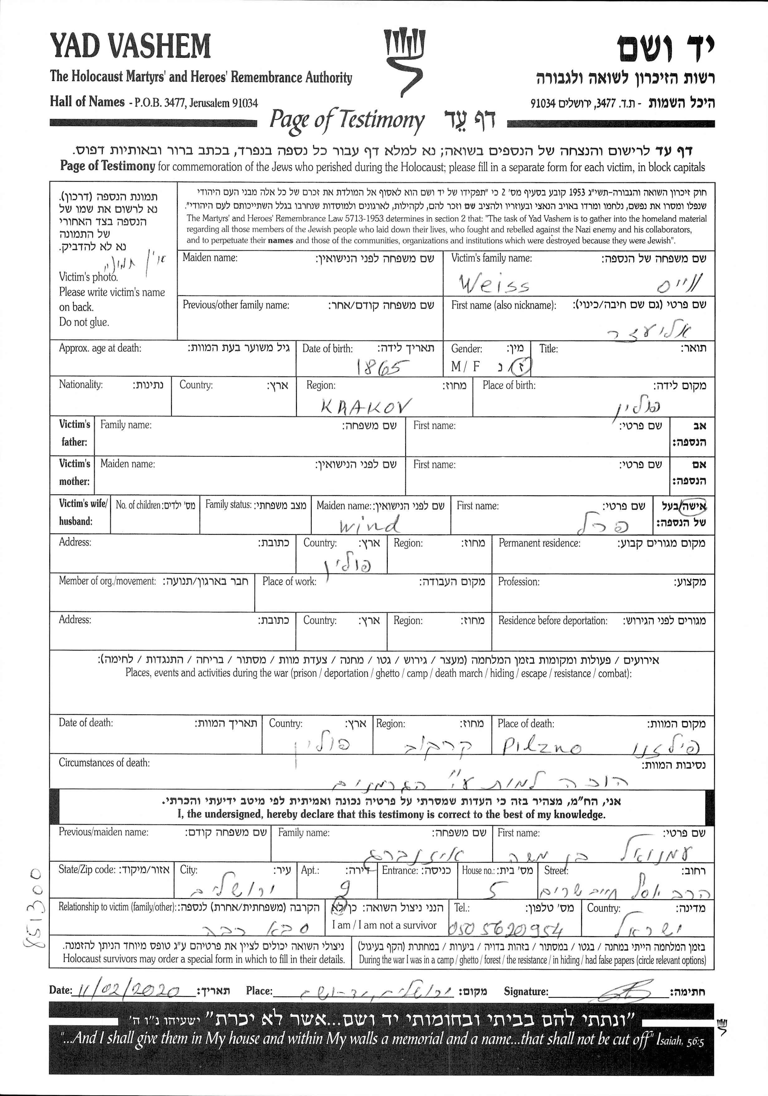 Eliezer Weiss wurde im Jahr 1865 in Krakow, Polen geboren. Er war mit Perel, geb. Wind Verheiratet. Vor dem Zweiten Weltkrieg lebte er in מקום מגורים לבדיקה.