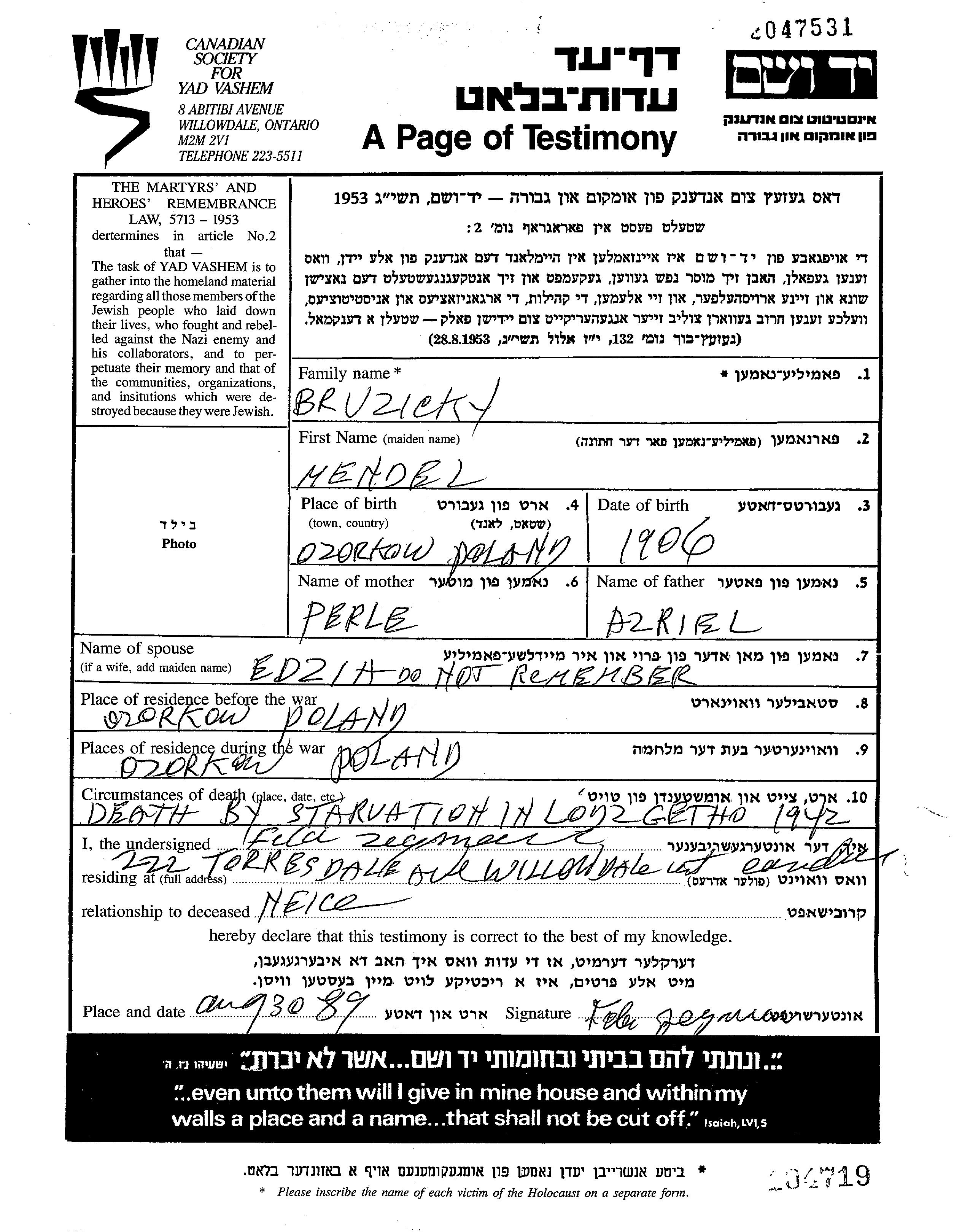 Mendel Bruzicky wurde in Ozorkow, Polen geboren. Er war der Sohn von Azriel und Perla. Er war mit Edzia Verheiratet. Vor dem Zweiten Weltkrieg lebte er in Ozorkow, Polen. Während des Krieges war er in Ozorkow, Polen.