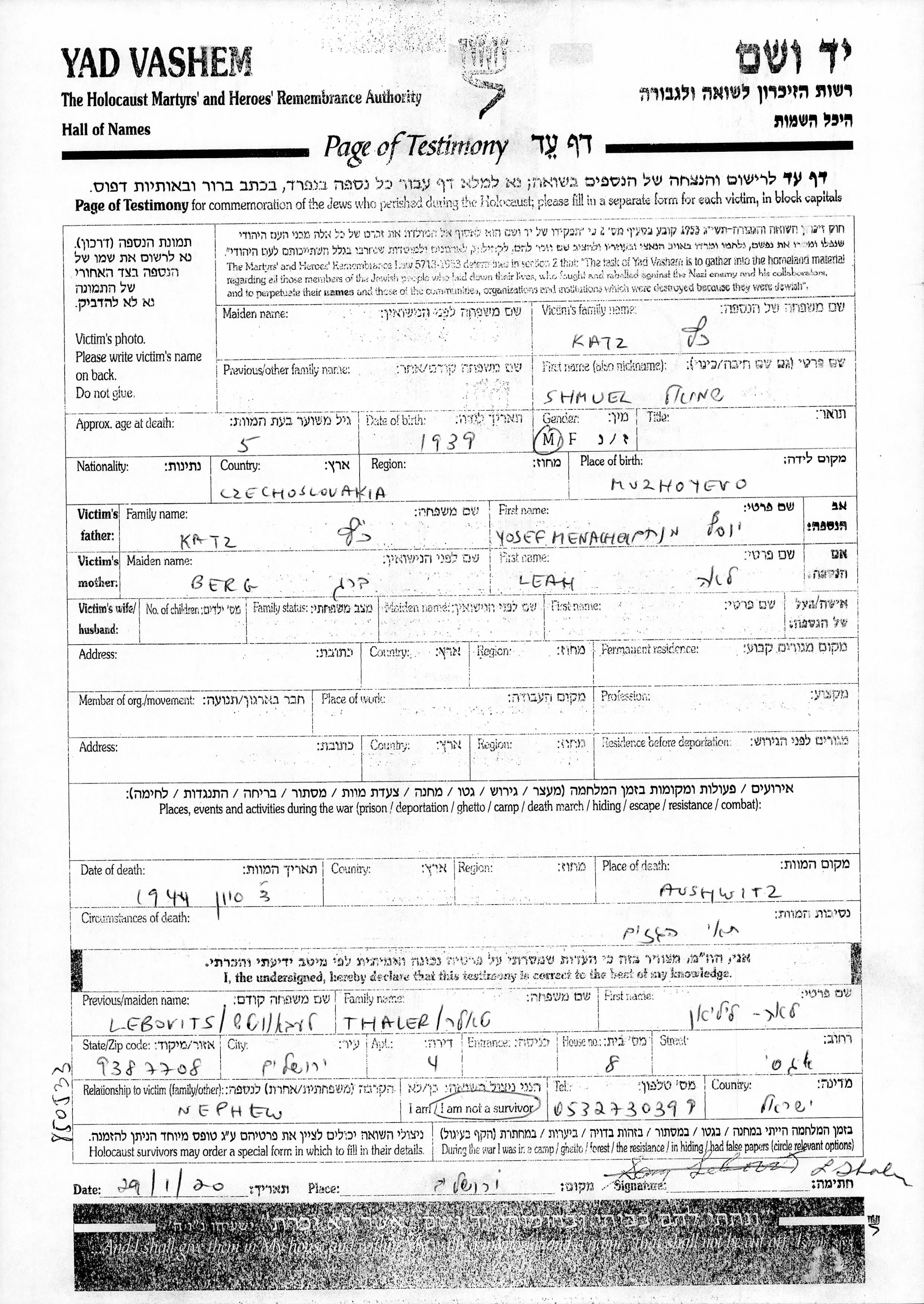 Katz Shmuel 1939 מקום מגורים לבדיקה, Gedenkblatt