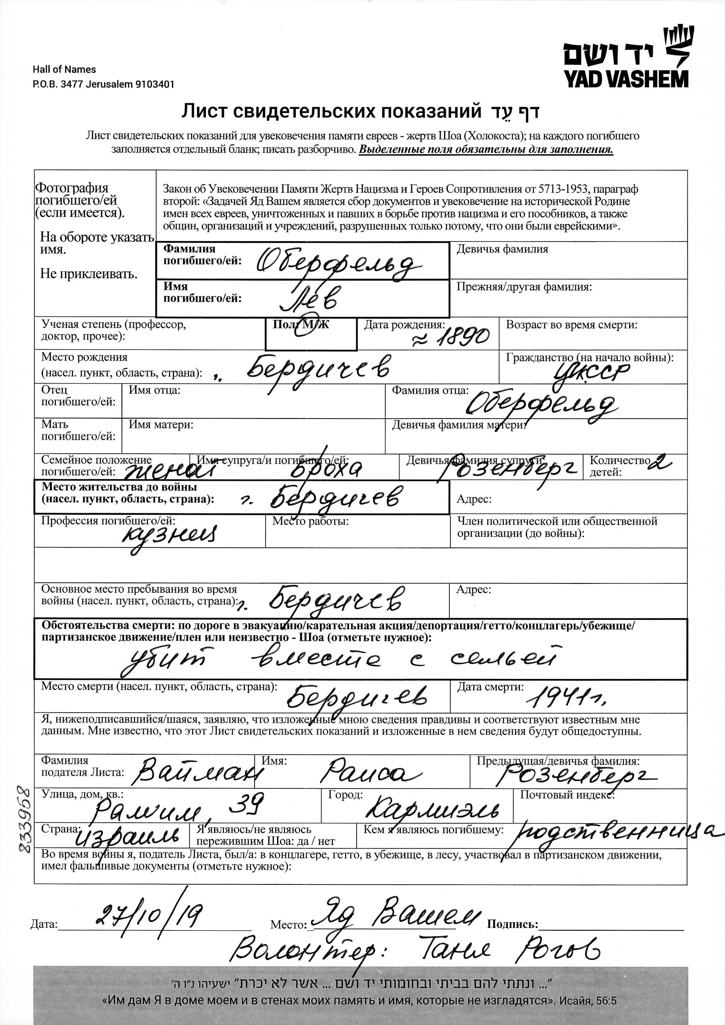 Lev Oberfeld wurde im Jahr 1890 in Berdichev, Ukraine (UdSSR) geboren. Er war Schmied und mit Brokha, geb. Rozenberg Verheiratet. Vor dem Zweiten Weltkrieg lebte er in Berdichev, Ukraine (UdSSR). Während des Krieges war er in Berdichev, Ukraine (UdSSR).