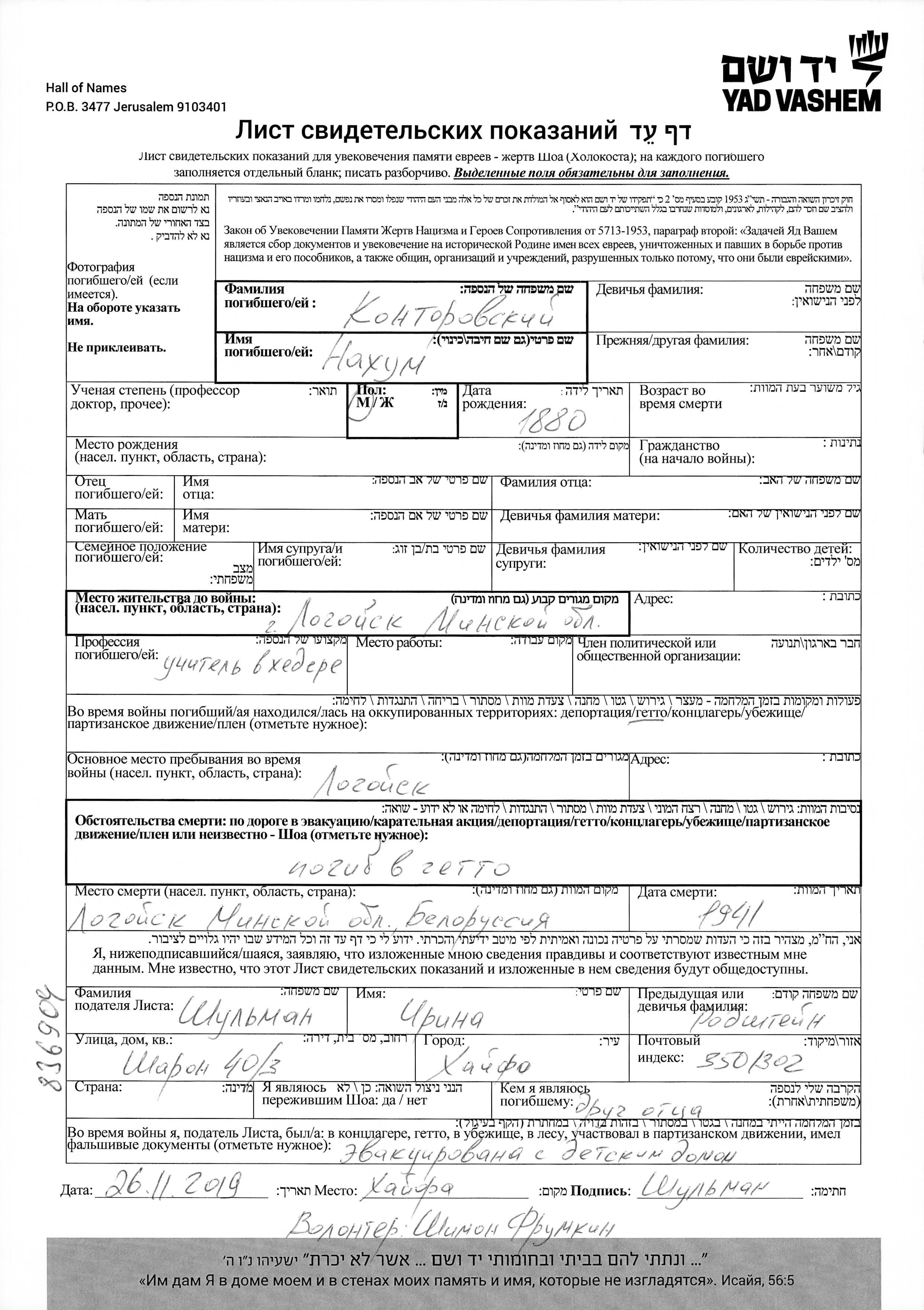 Nakhum Kontorovski wurde im Jahr 1880 geboren. Er war Religious elementary school teacher. Vor dem Zweiten Weltkrieg lebte er in Logoysk, Weißrussland (UdSSR). Während des Krieges war er in Logoysk, Weißrussland (UdSSR).