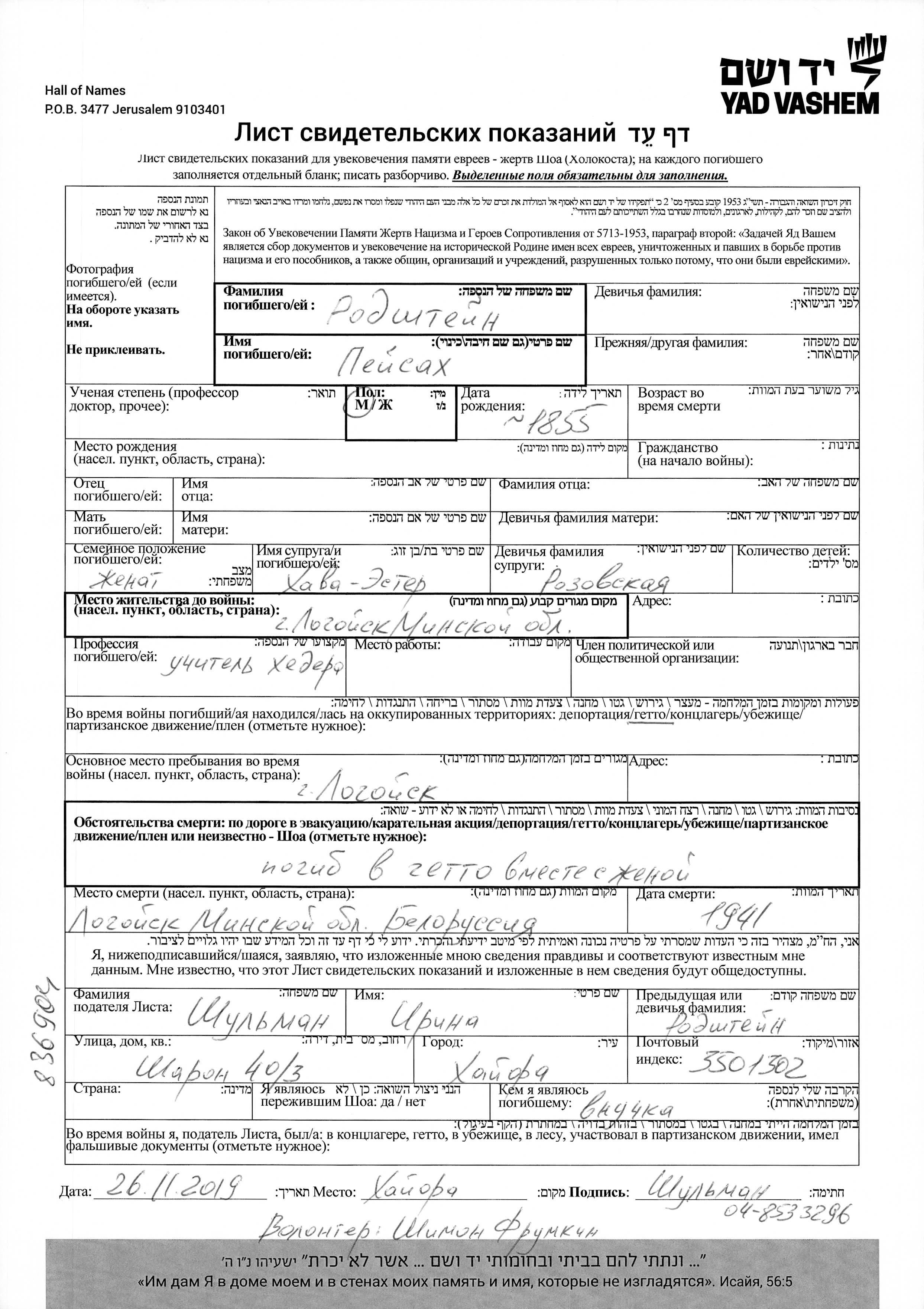Peysakh wurde in der Schoah ermordet. Todesort: Logoysk, Weißrussland (UdSSR) im Jahr 1941.
