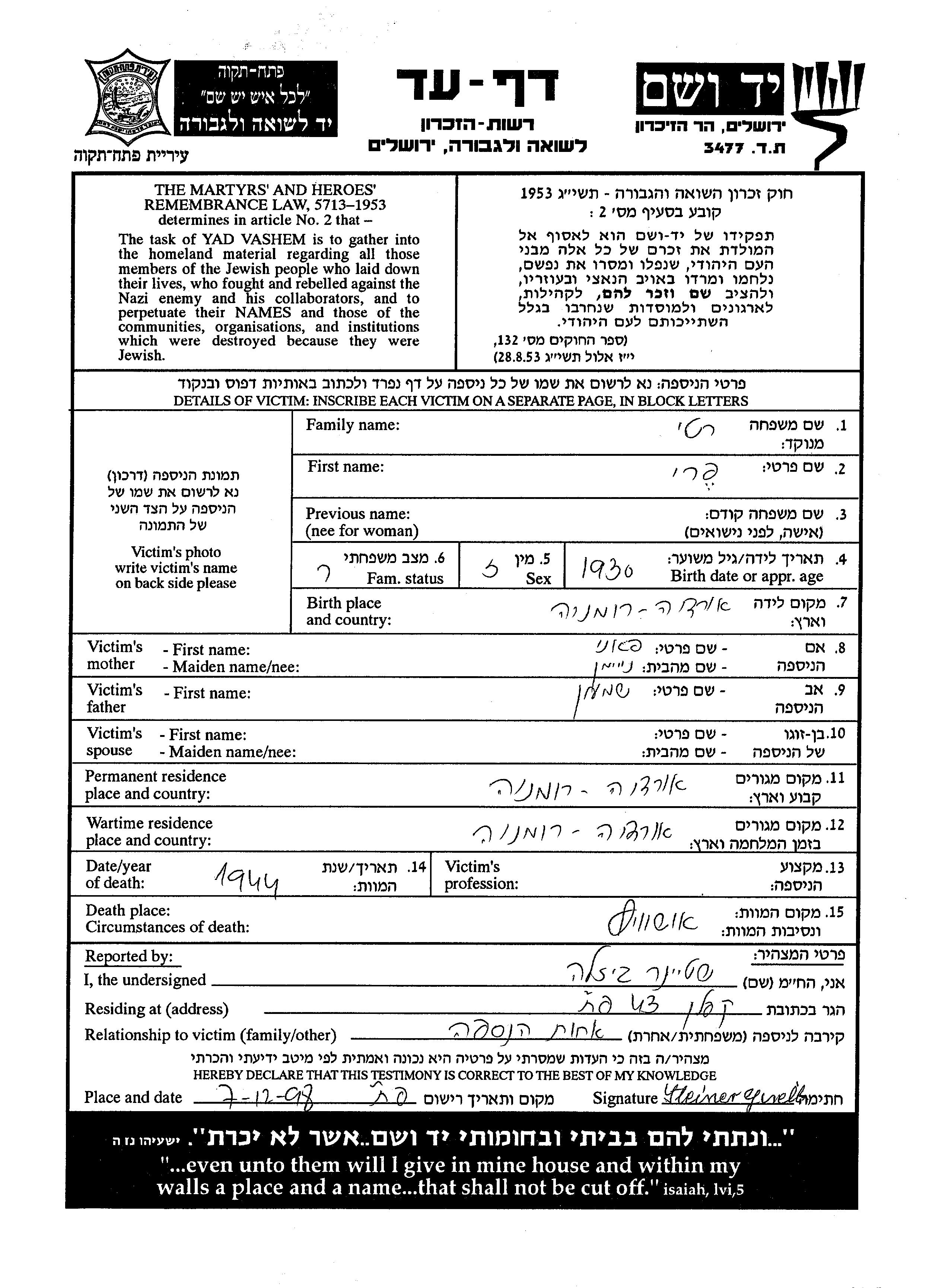 Feri wurde in der Schoah ermordet. Todesort: unbekannt im Jahr 1944.