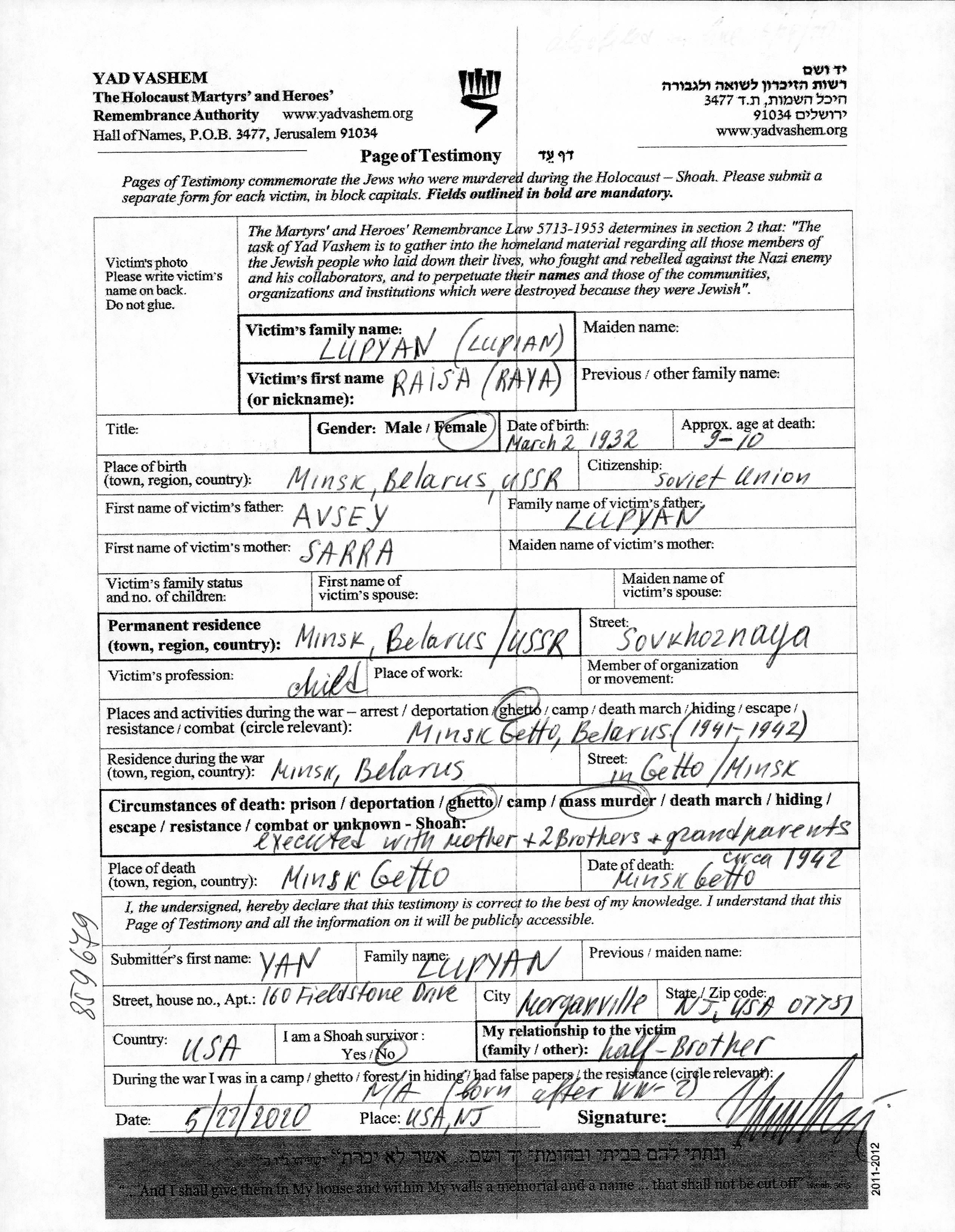 Raisa Lupyan wurde im Jahr 1932 in Minsk, Weißrussland (UdSSR) geboren. Sie war die Tochter von Avsey und Sarra. Sie war Kind. Vor dem Zweiten Weltkrieg lebte sie in Minsk, Weißrussland (UdSSR). Während des Krieges war sie in Minsk, Weißrussland (UdSSR).
